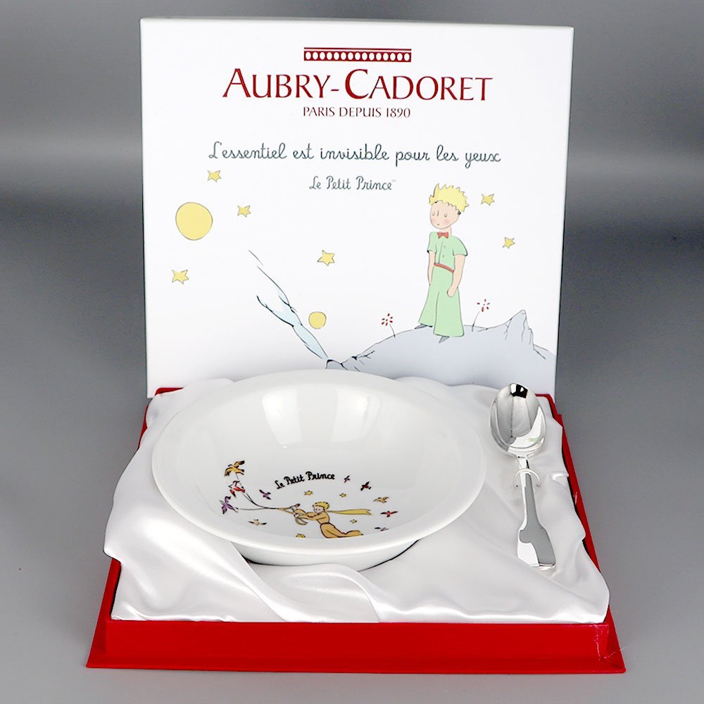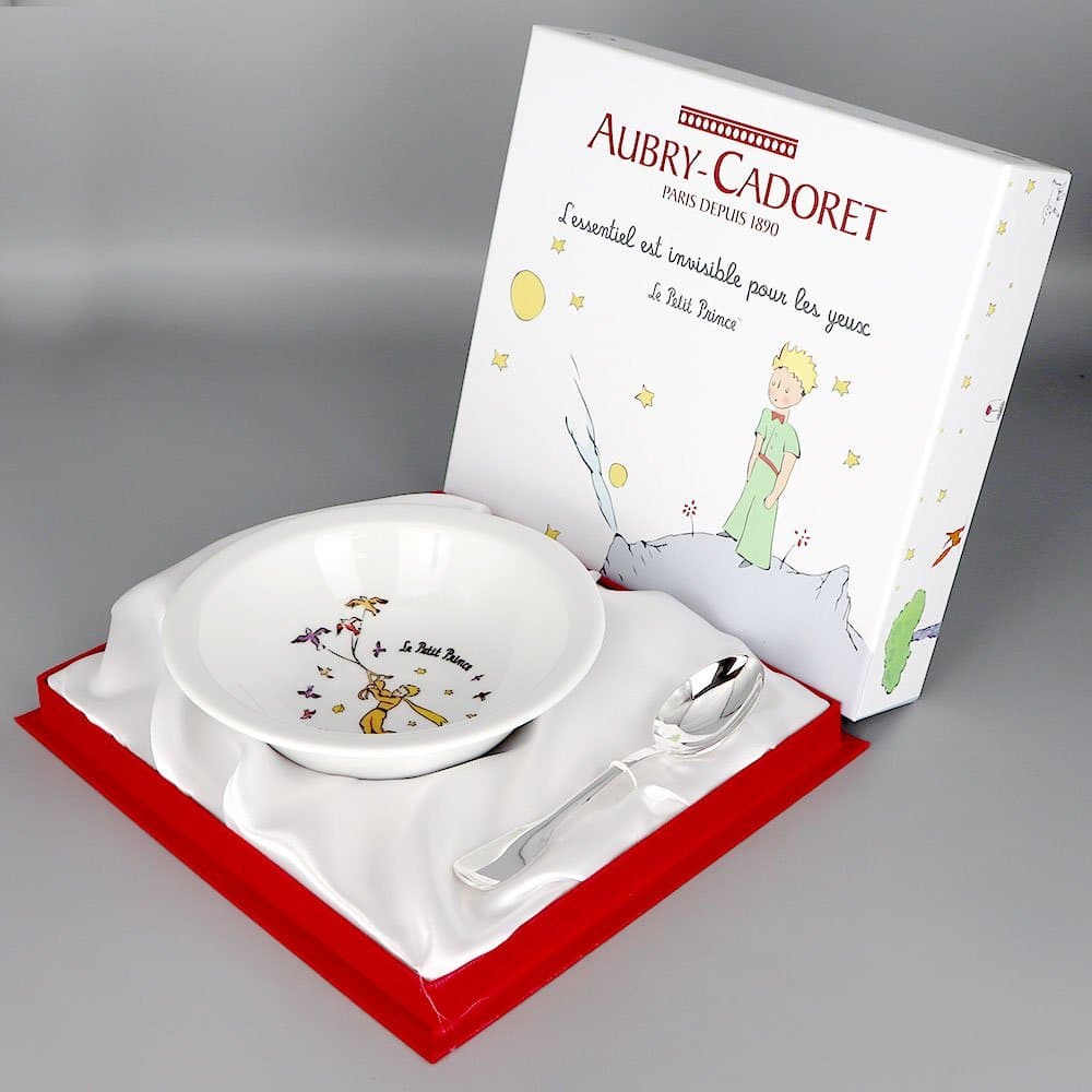 Assiette en porcelaine sous licence officielle Le Petit Prince Ø 160 mm avec cuillère en inox 14 cm.