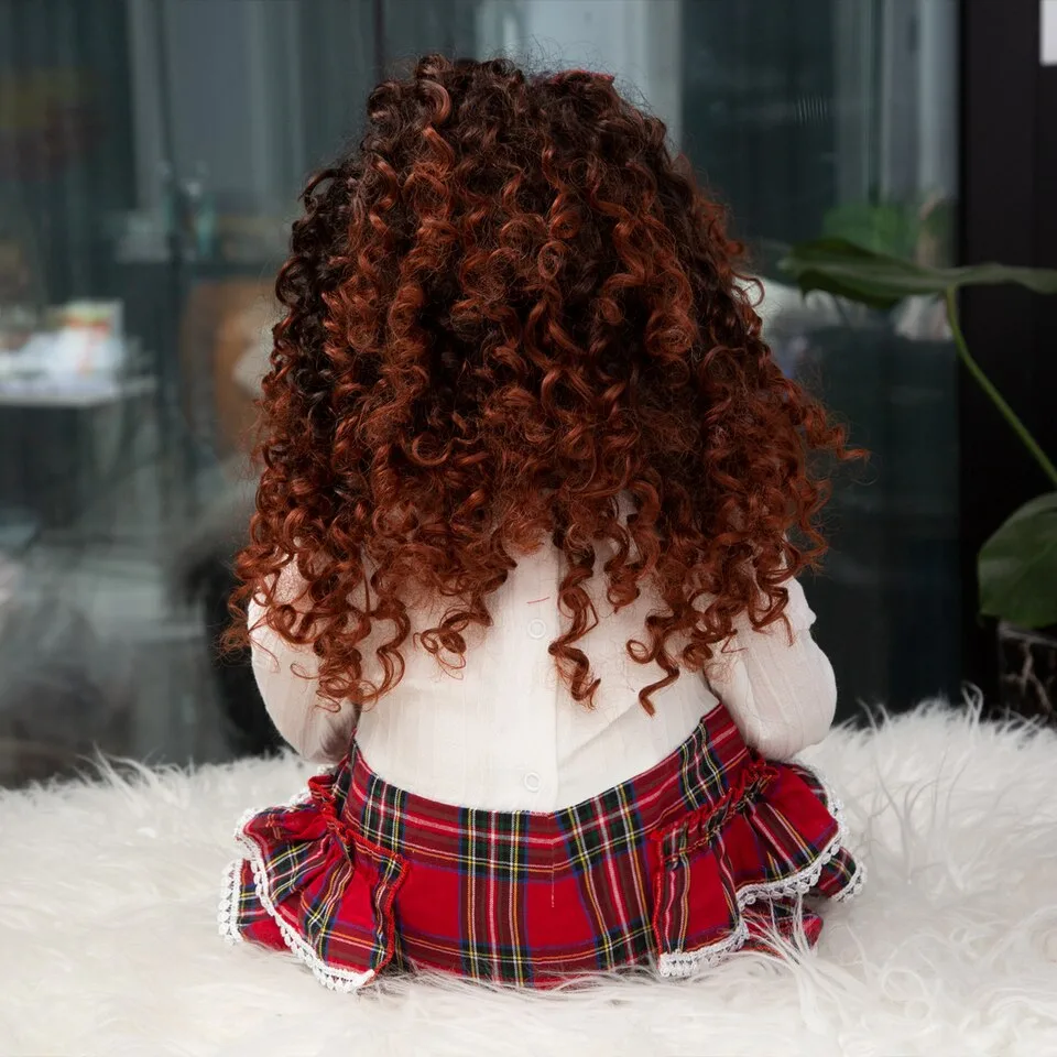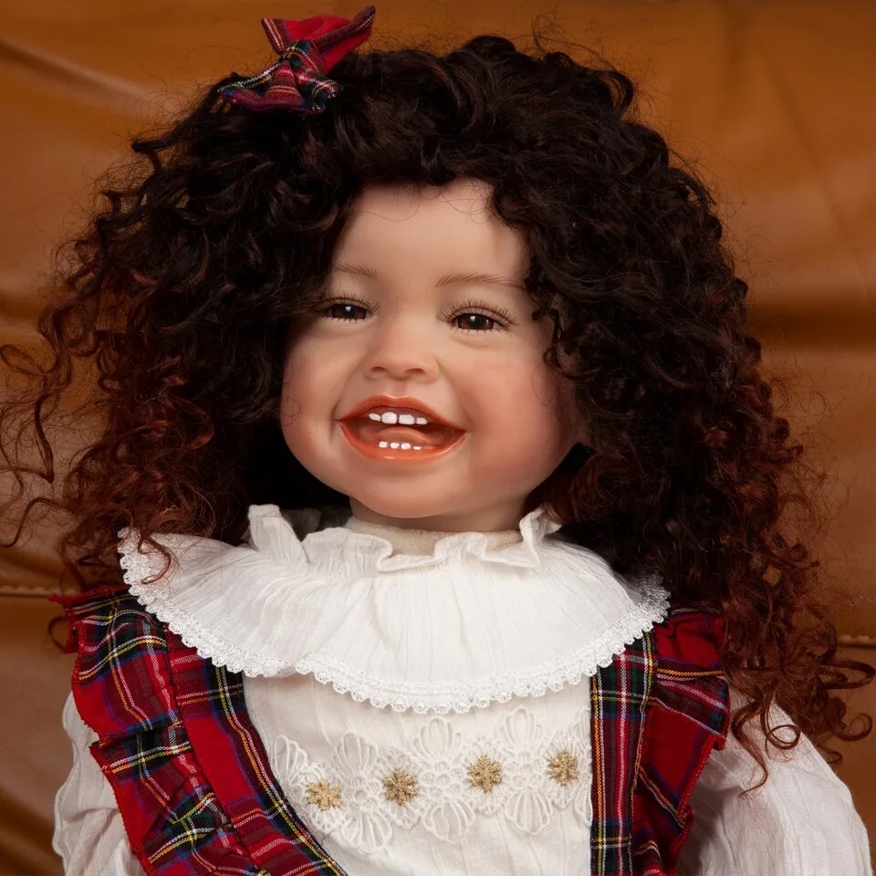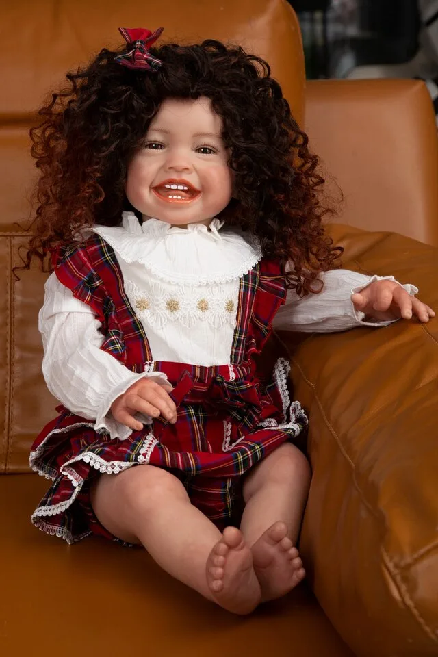 Les membres de cette poupée reborn sont articulés, ce qui permet de la positionner facilement en position assise ou allongée. Ses magnifiques yeux foncés avec reflets bleus, agrémentés de cils implantés à la main, sont à tomber par terre. Ses cheveux bouclés sont doux au toucher grâce à une perruque collée à la main.