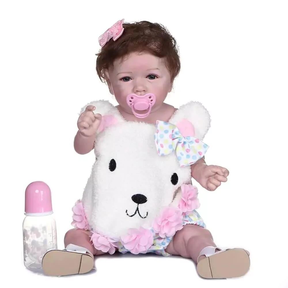 Découvrez notre adorable bébé reborn aux cheveux aux reflets roux, avec une taille de 56 cm et un poids d’environ 1,5 kg. Ses cheveux en mohair ont été soigneusement implantés à la main et sont légèrement ondulés. Le corps complet de cette poupée est en vinyle de silicone, ce qui lui permet de prendre un bain comme un vrai bébé.