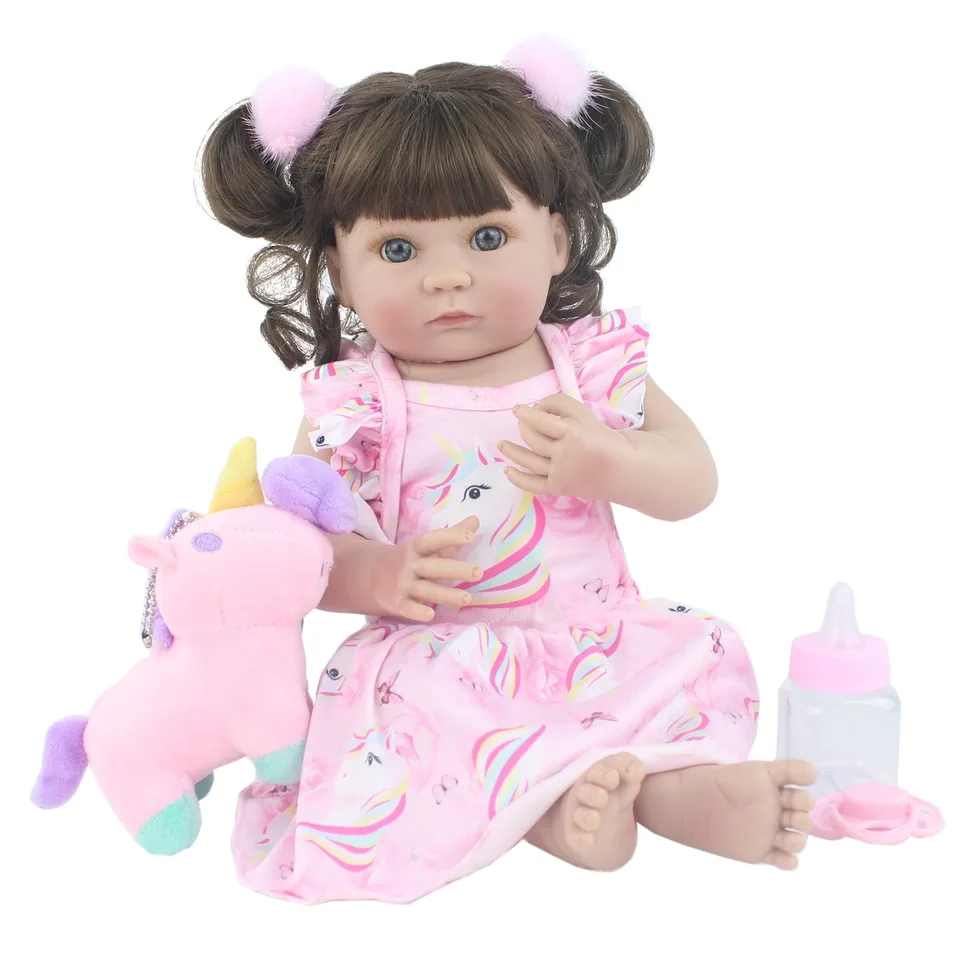 Plongez dans un monde enchanté avec Esperanza, la merveilleuse poupée reborn fille aux cheveux bruns et à la frange espiègle. Cette petite princesse est vêtue d’une adorable robe représentant une licorne, apportant une touche de magie à son apparence déjà féérique.