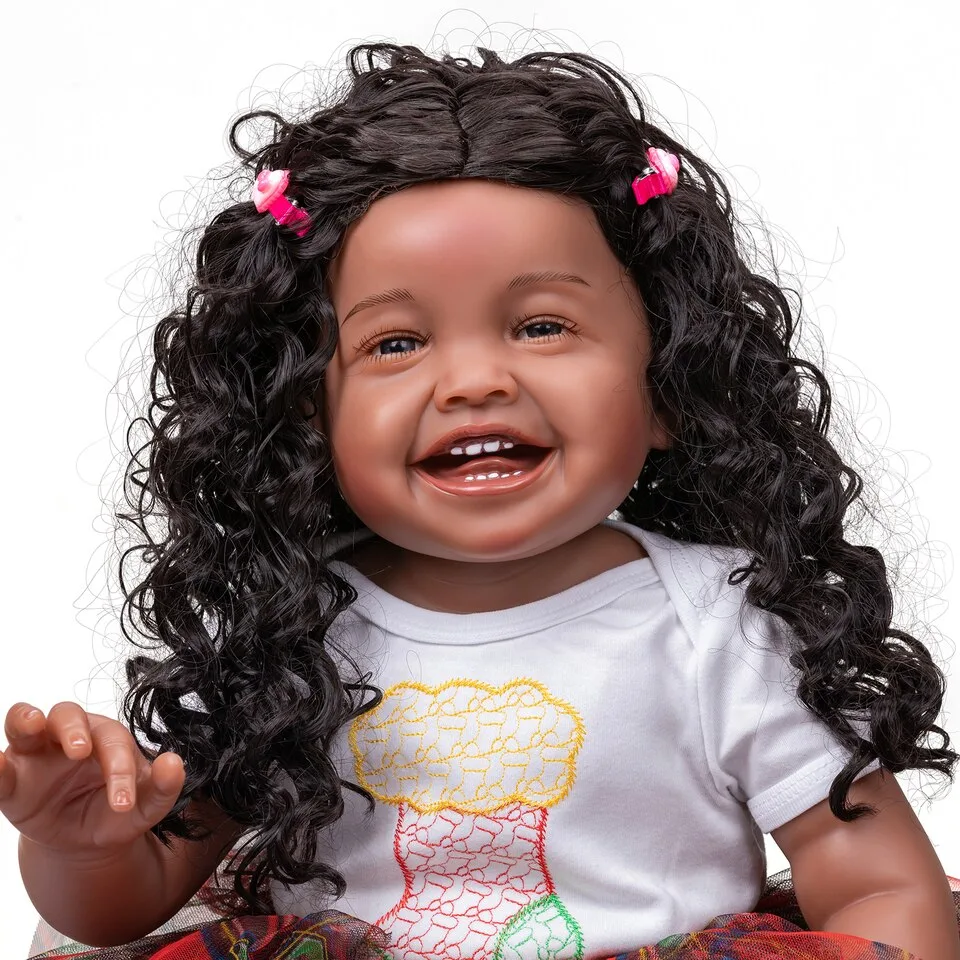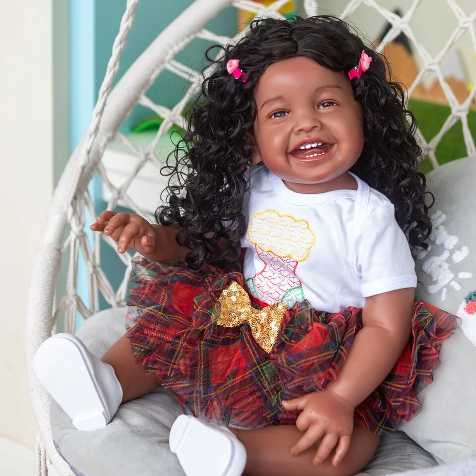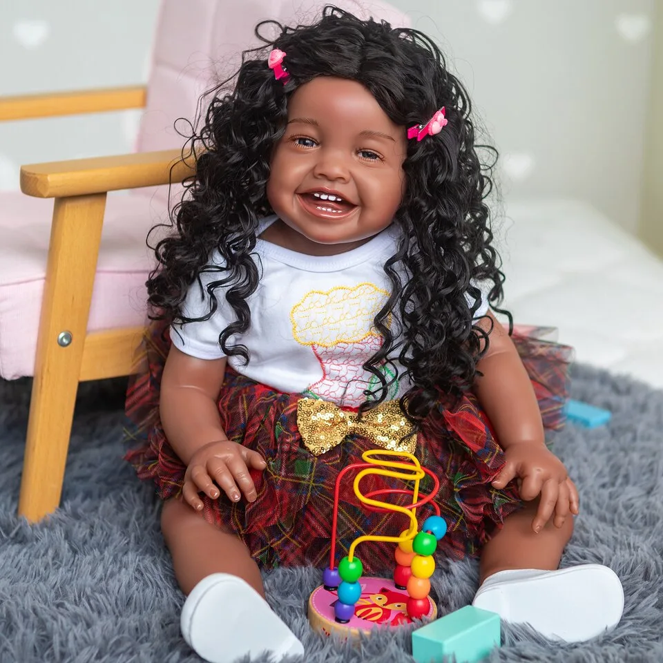 Les membres de cette poupée reborn sont articulés, ce qui permet de la positionner facilement en position assise ou allongée. Ses magnifiques yeux foncés avec reflets bleus, agrémentés de cils implantés à la main, sont à tomber par terre. Ses cheveux bouclés sont doux au toucher grâce à une perruque collée à la main.