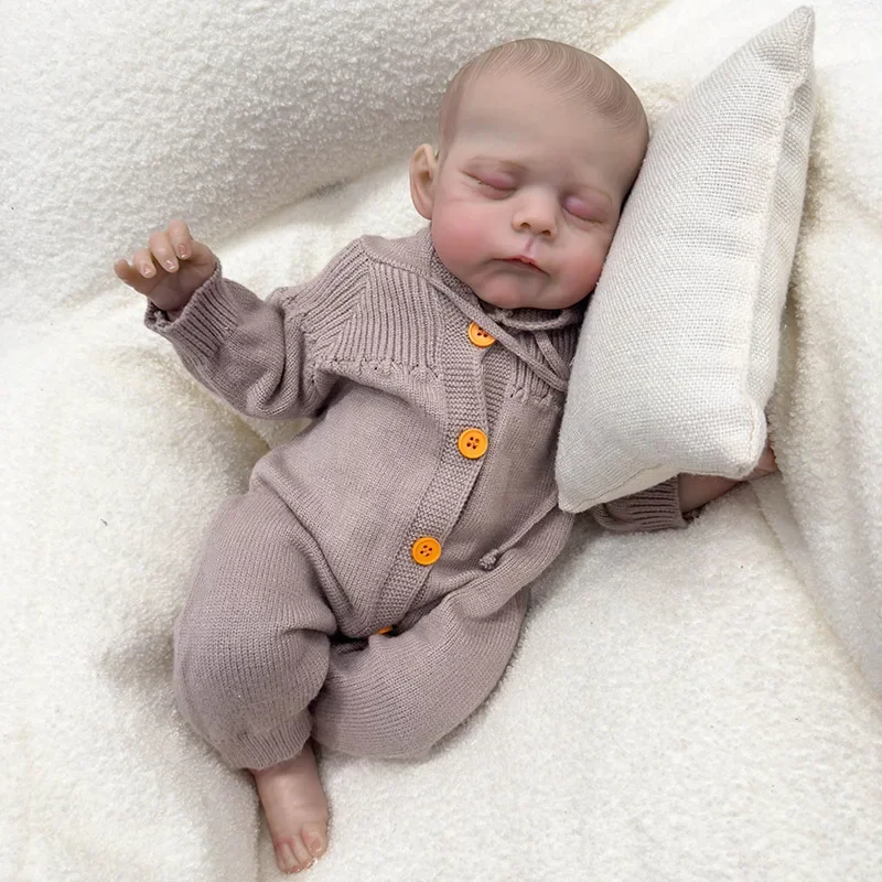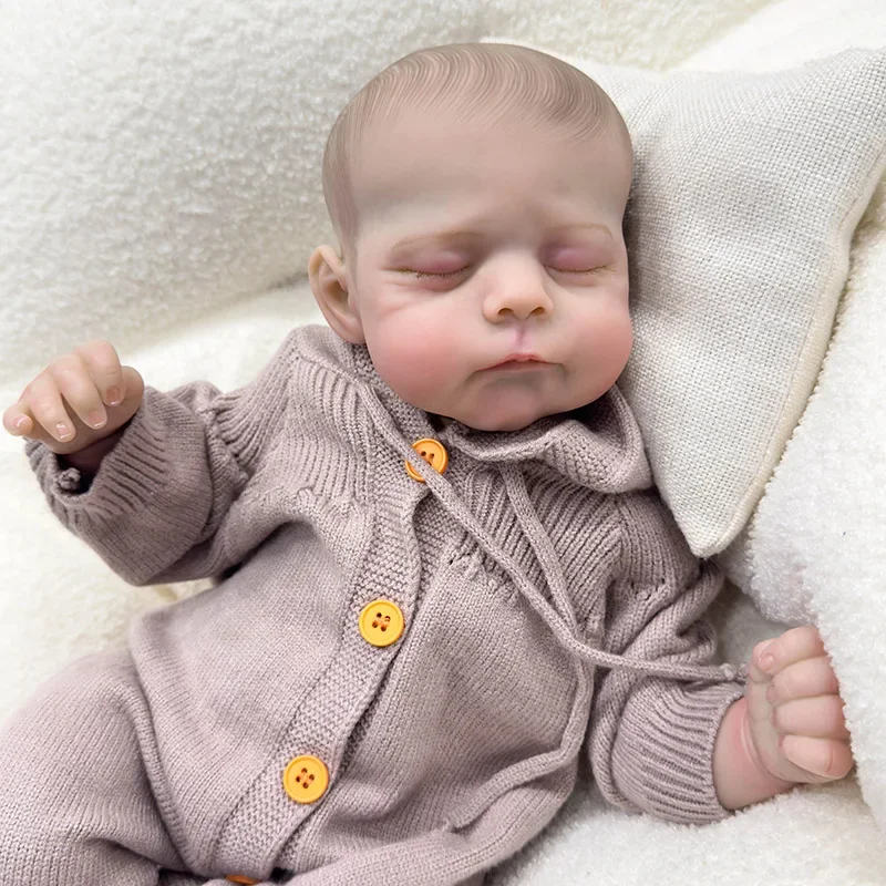 Découvrez Joshua, un bébé reborn garçon de 48 cm, conçu avec une attention méticuleuse pour offrir une expérience des plus réalistes. Ce poupon endormi, aux traits délicats et aux cheveux peints à la main, est le compagnon idéal pour ceux qui recherchent une poupée authentique et apaisante.