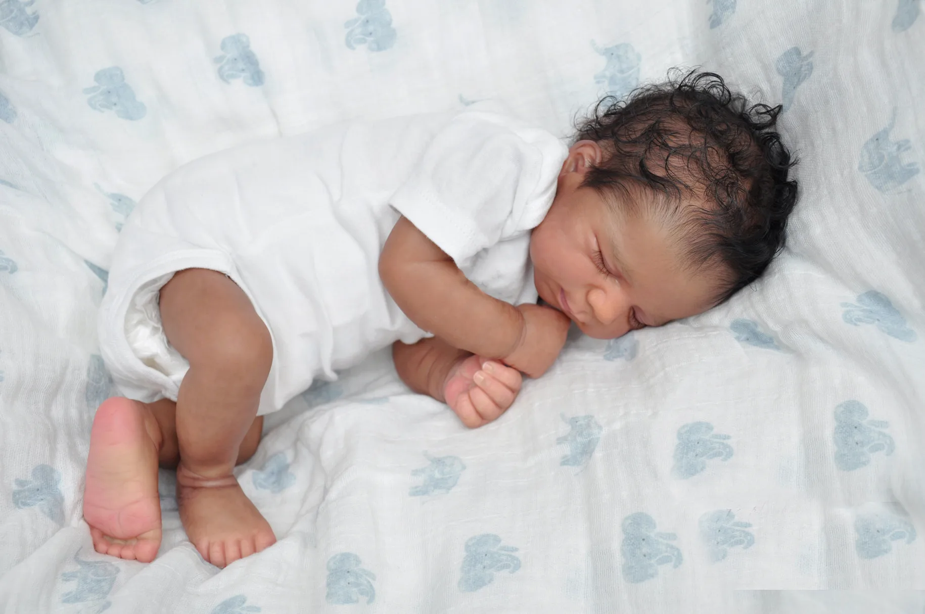 Malick vous séduira immédiatement avec sa peau chocolat soyeuse, ses paupières closes, et ses cheveux enracinés à la main, pour un effet ultra naturel. Sa position de sommeil, ses traits finement sculptés et sa texture réaliste en font une poupée reborn idéale pour les collectionneurs, mais aussi pour les enfants ou adultes en quête de réconfort.