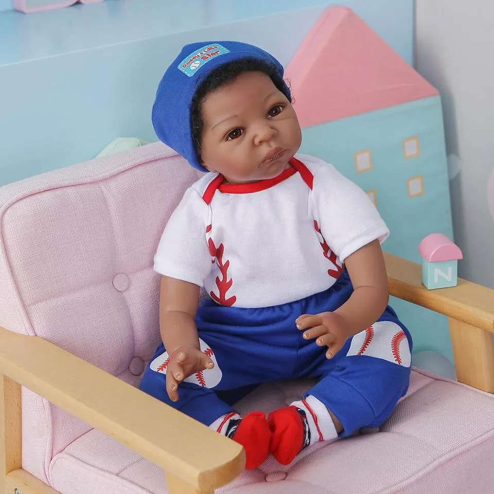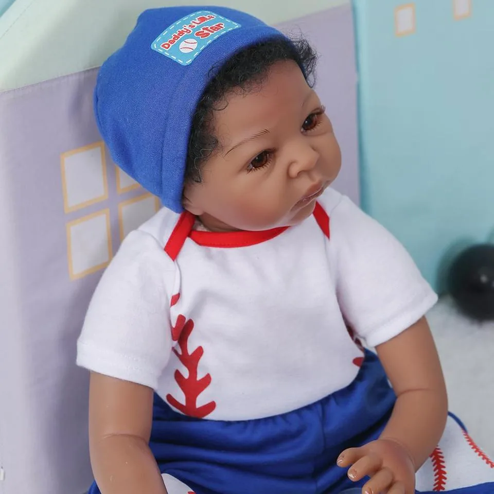 Tenue : Tidiane sera vêtu exactement comme sur les images, avec son bonnet bleu et sa tenue de baseball. Vous avez également la possibilité de lui changer de vêtements, car les vêtements de taille 0 à 3 mois conviennent parfaitement à cette poupée.