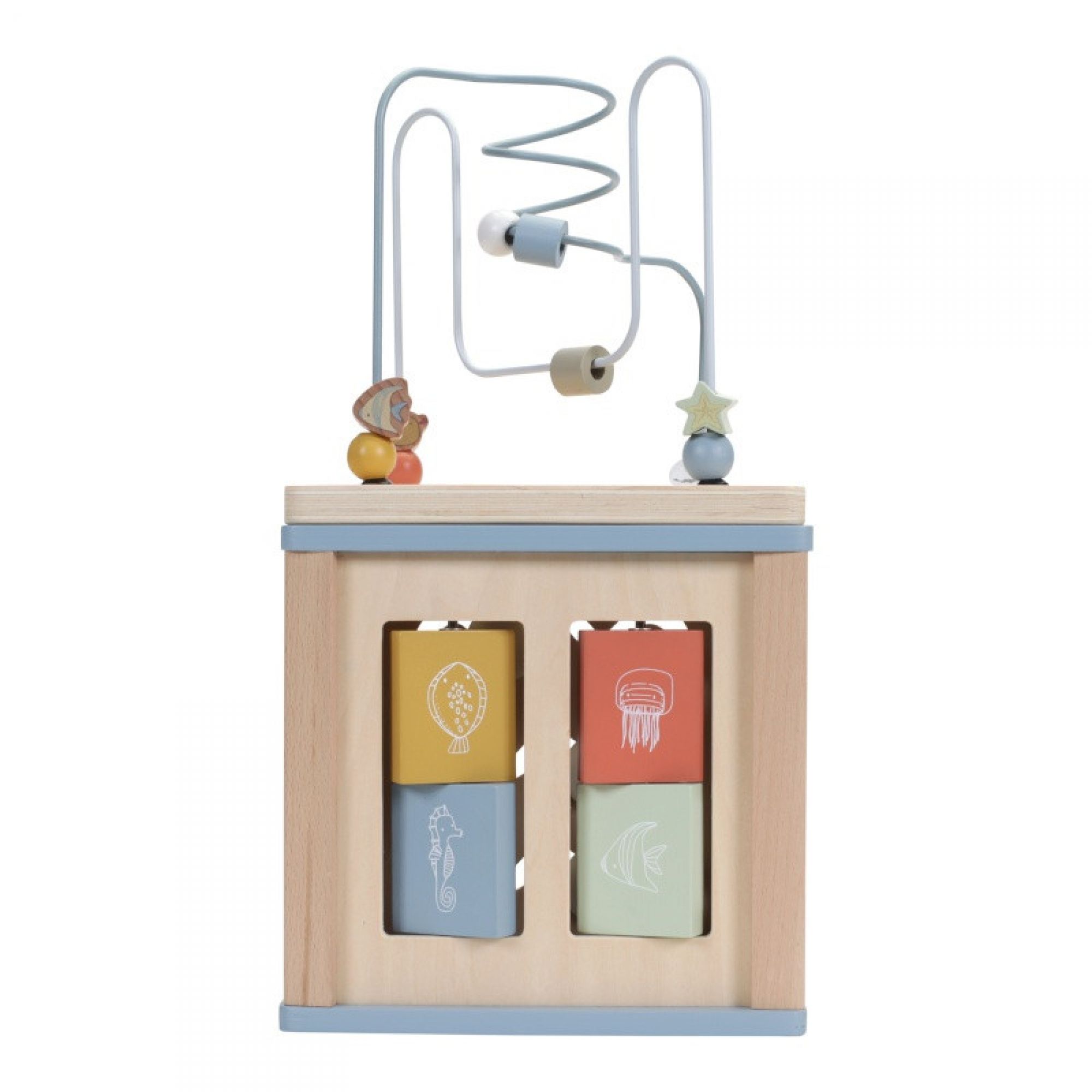 Développement des sens, de la concentration et de la coordination grâce ce joli cube multi-activités en bois bleu ! Un jouet très complet qui promet de nombreuses découvertes !