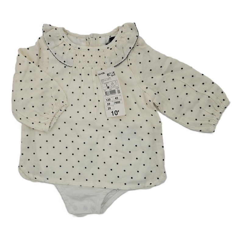 Body bébé fille 3 MOIS KIABI Manches longues écru avec au dessus une liquette écru à pois noirs Fermeture boutons dans le dos et pressions à l’entrejambe