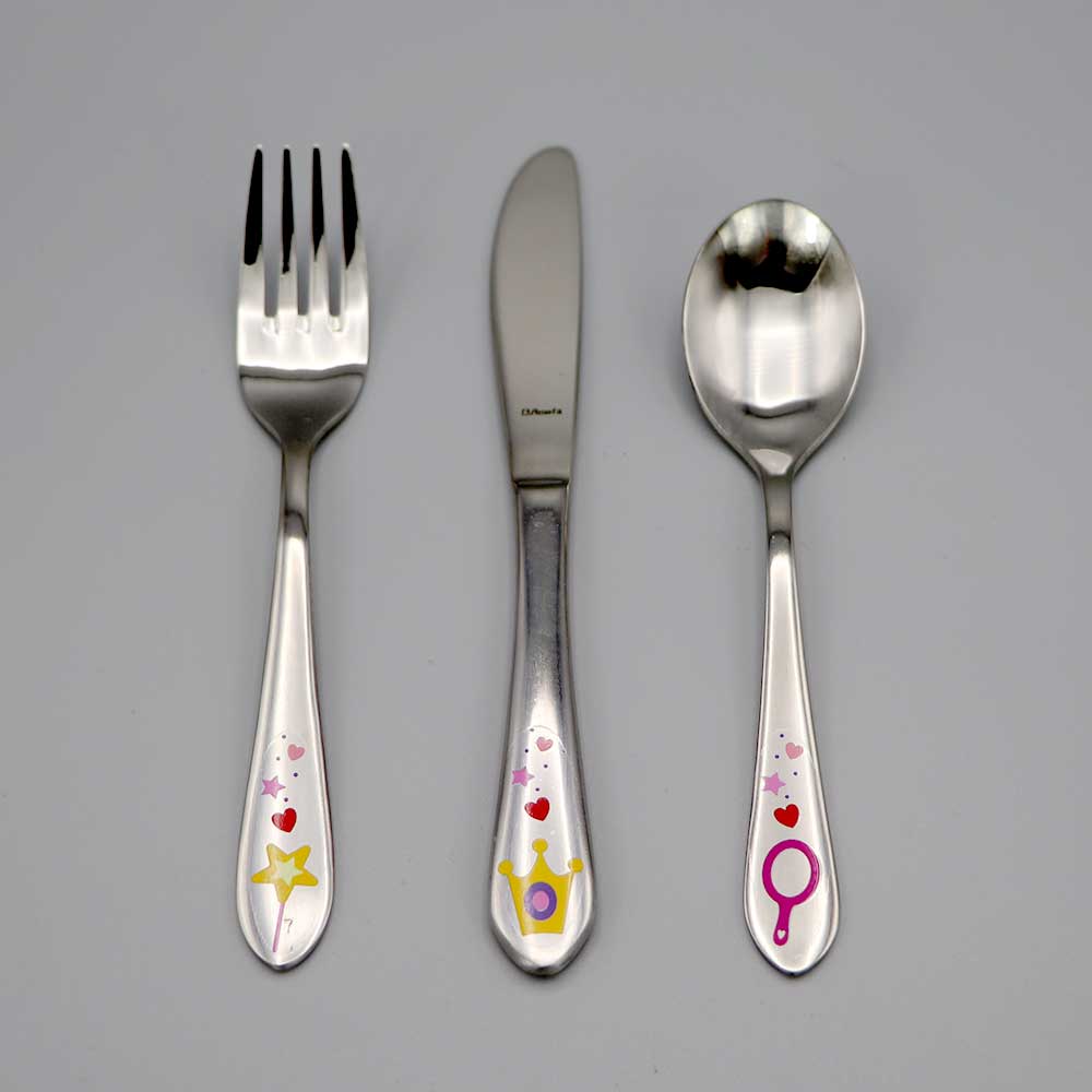 Cuillère, fourchette et couteau, 3 pièces avec un dessin de Princesse.