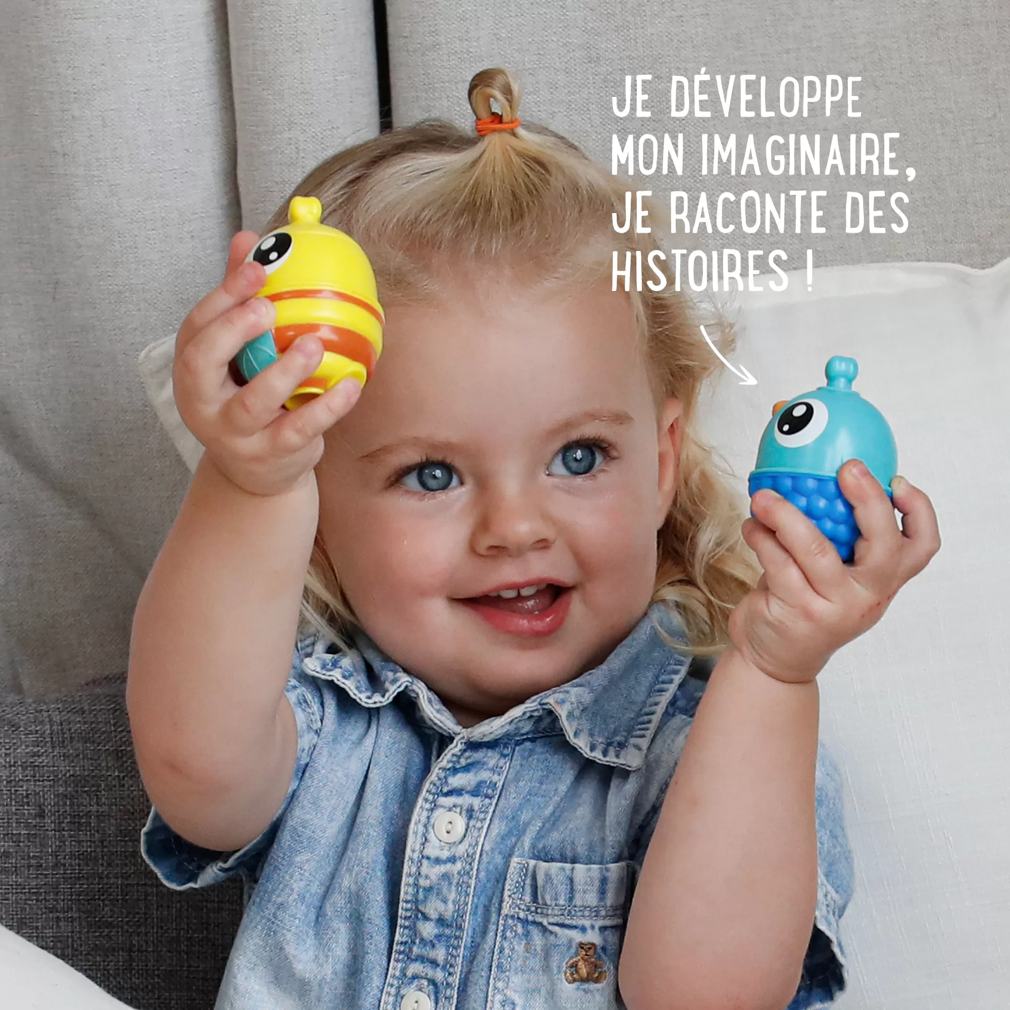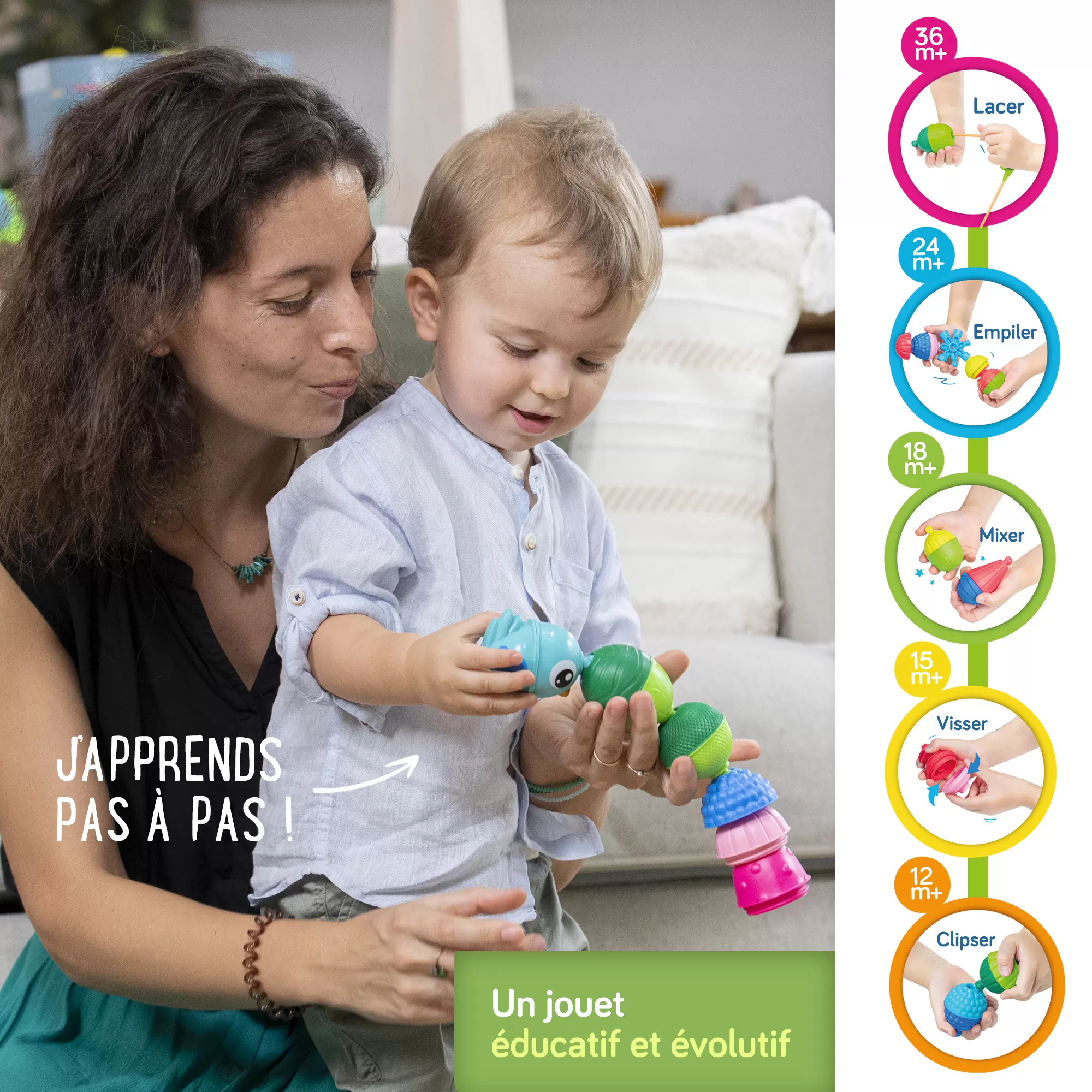 - +24 mois : Je clipse, j’insère et assemble les perles et accessoires pour construire des séquences toujours plus élaborées. Des centaines de combinaisons possibles !