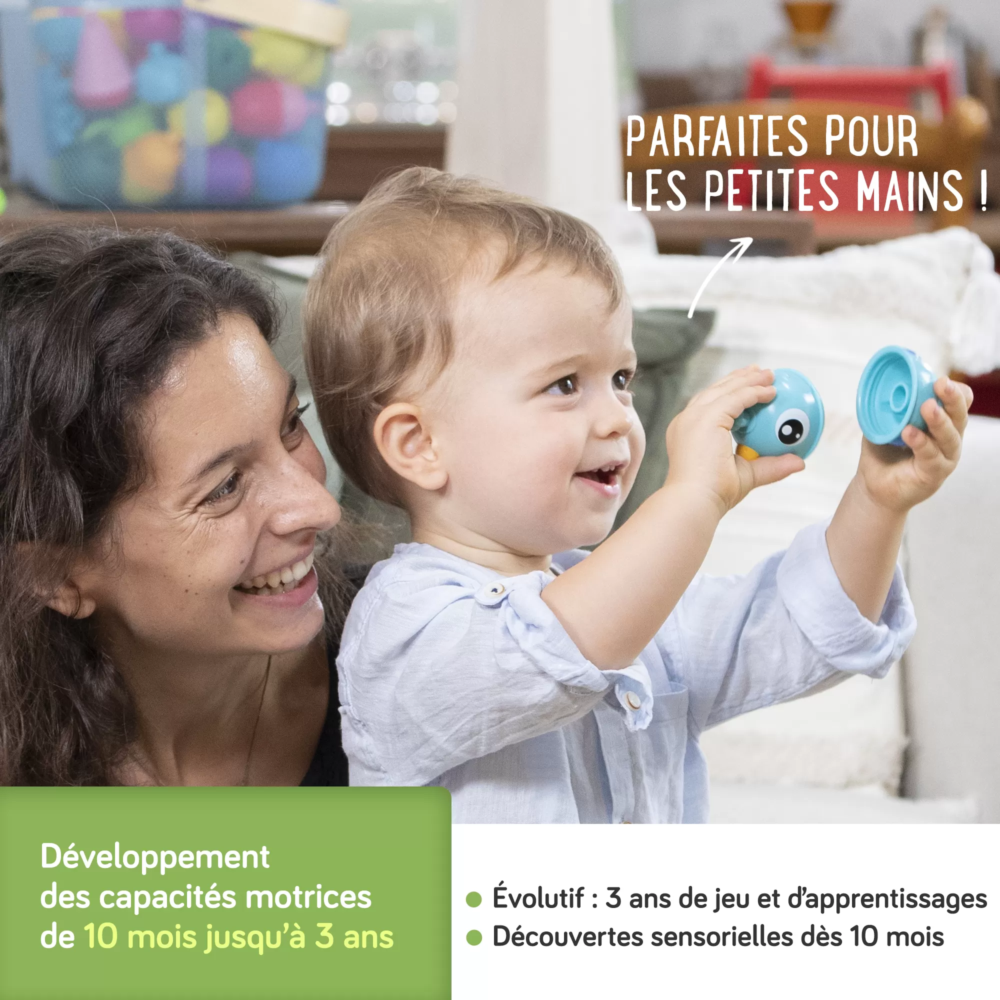 - +10 mois : Découverte des textures, couleurs et formes de perles.