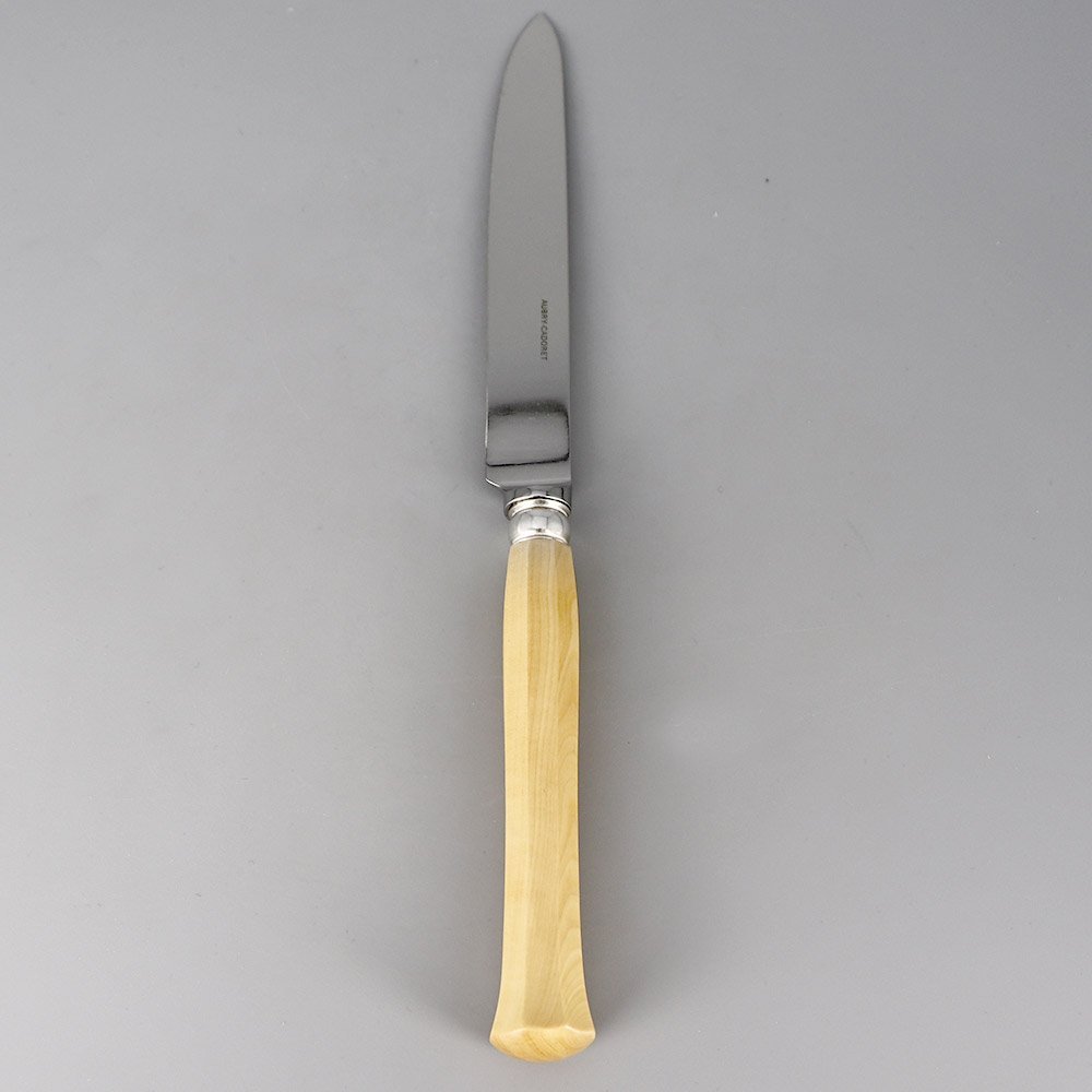 Ligne de couverts en inox et métal argenté (virole et culot), une collection des arts de la table de tradition française, manche buis. Egalement disponible en palissandre ou ébène. Lame forgée.