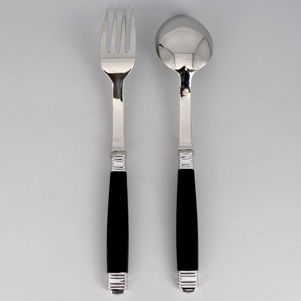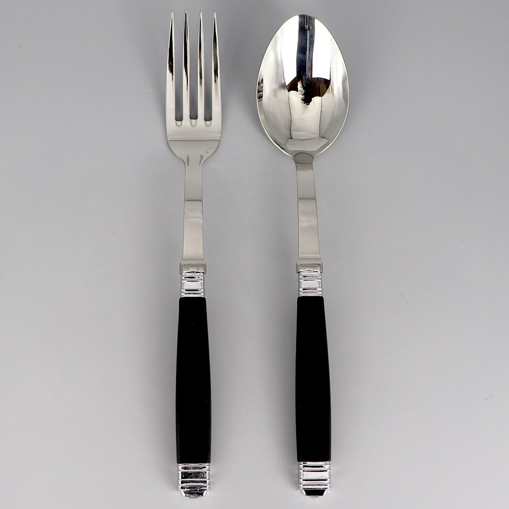 Cuillère à servir noire EMPIRE et fourchette à servir noire EMPIRE. Le fameux modèle de couvert noir intemporel à 2 viroles. Couverts fabriqués en France et livrés en coffret cadeau. Manche résine et haut inox.