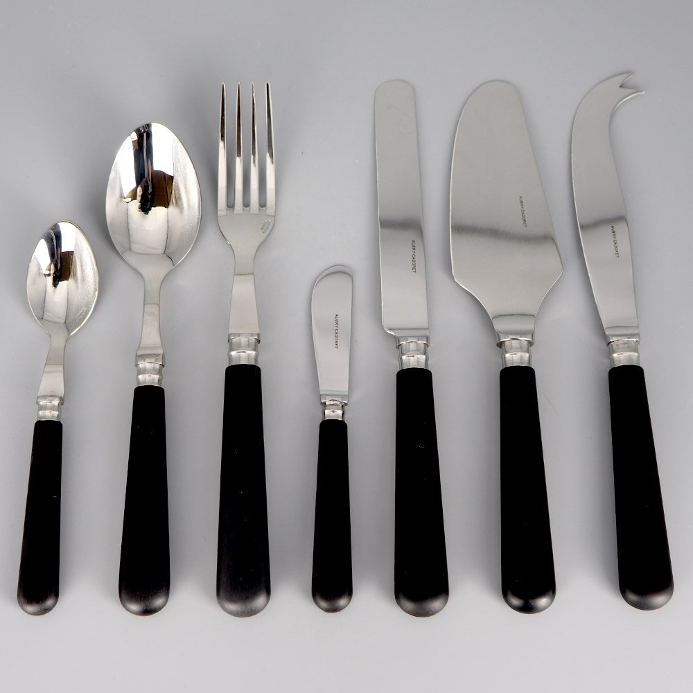 Cette ligne de couverts en inox est une collection des arts de la table de tradition française, disponible en deux couleurs : en ivoire et noir.