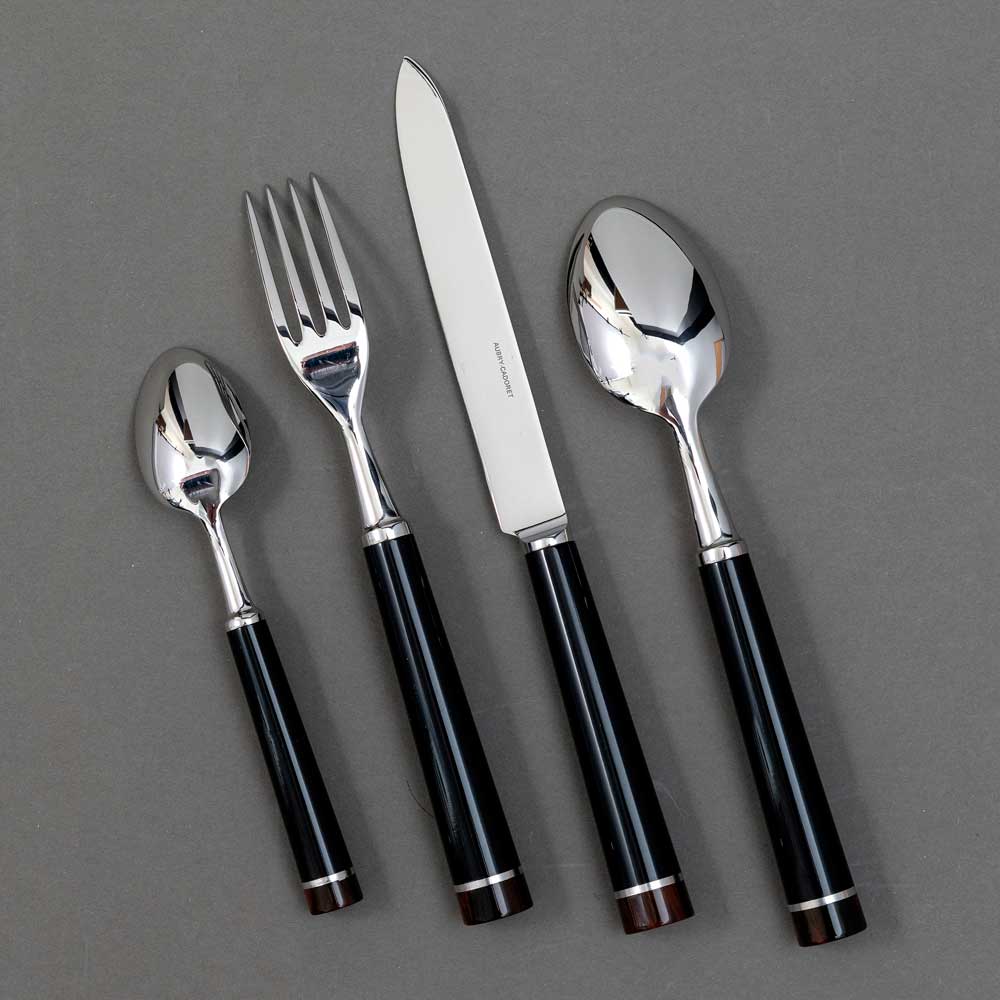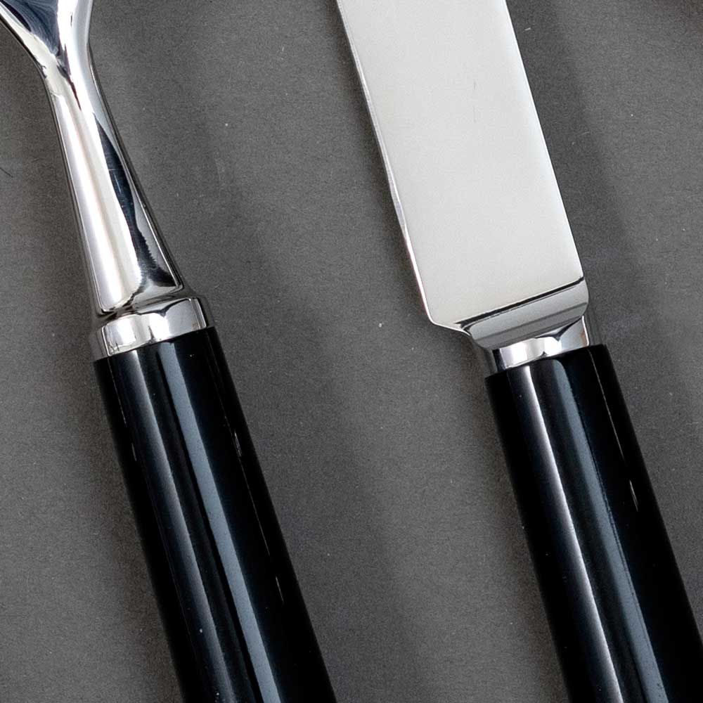 Ligne de couverts en inox et métal argenté (virole et culot), une collection des arts de la table de tradition française, disponible en manche couleur noire et ivoire.