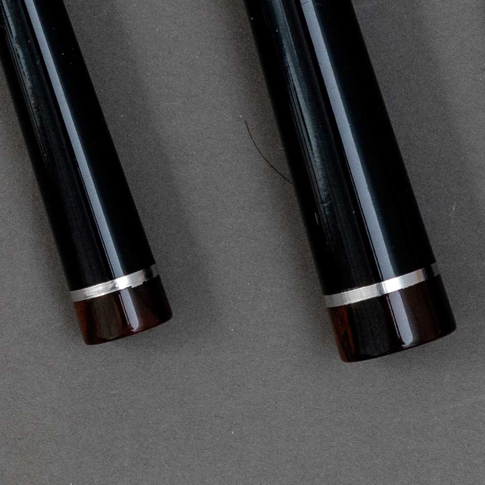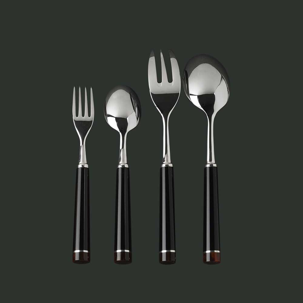 Couverts en inox. Virole et culot en métal argenté avec embout noir marbré. Manche en résine couleur noire.