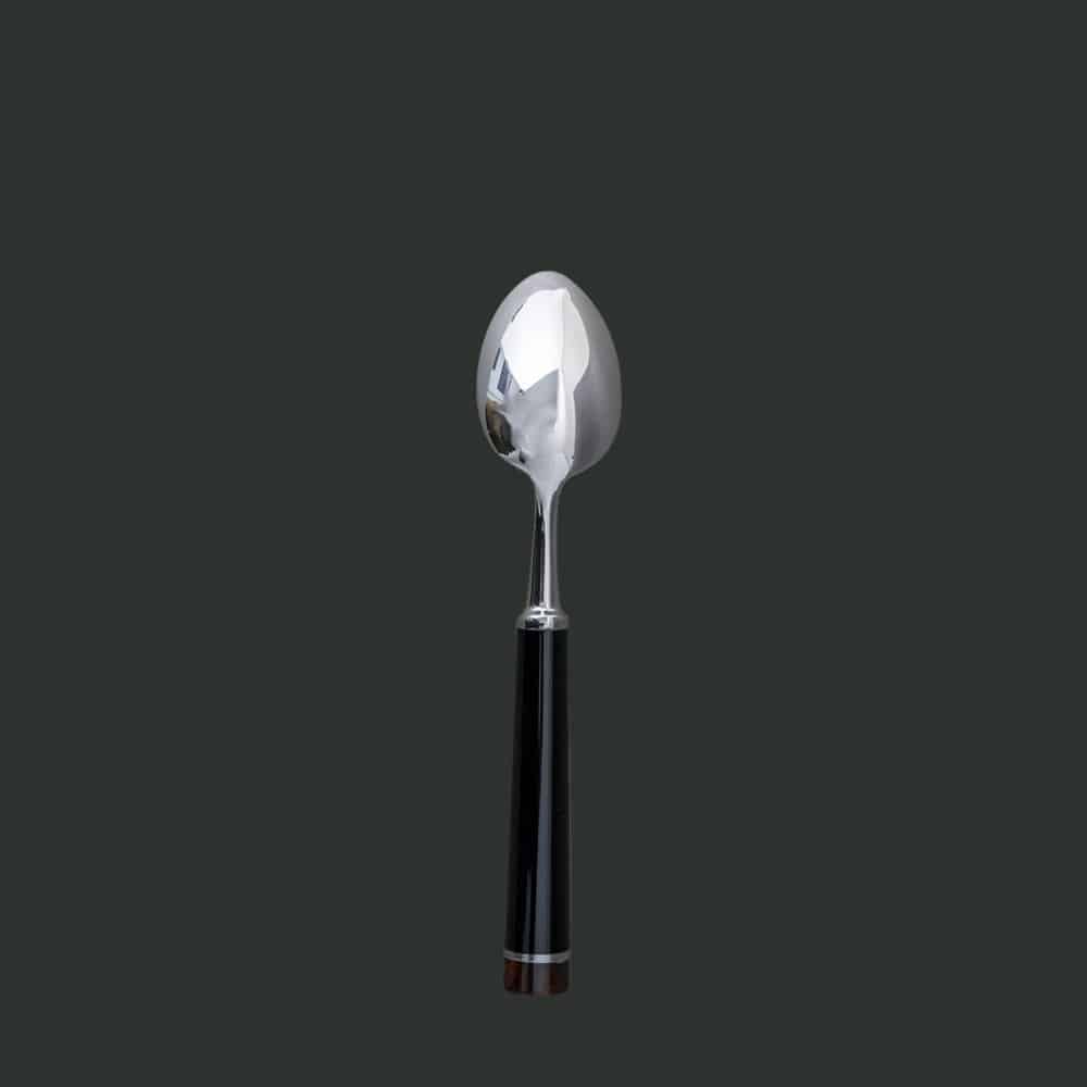 Cuillère à dessert SPHERE en inox. Virole et culot en métal argenté avec embout noir marbré. Manche en résine couleur noire.