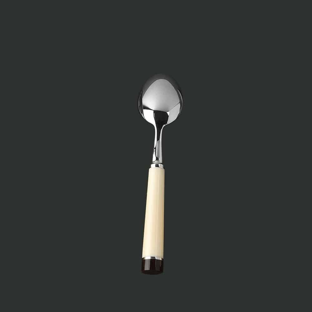 Cuillère de table SPHERE en inox. Virole et culot en métal argenté avec embout noir marbré. Manche en résine couleur ivoire.