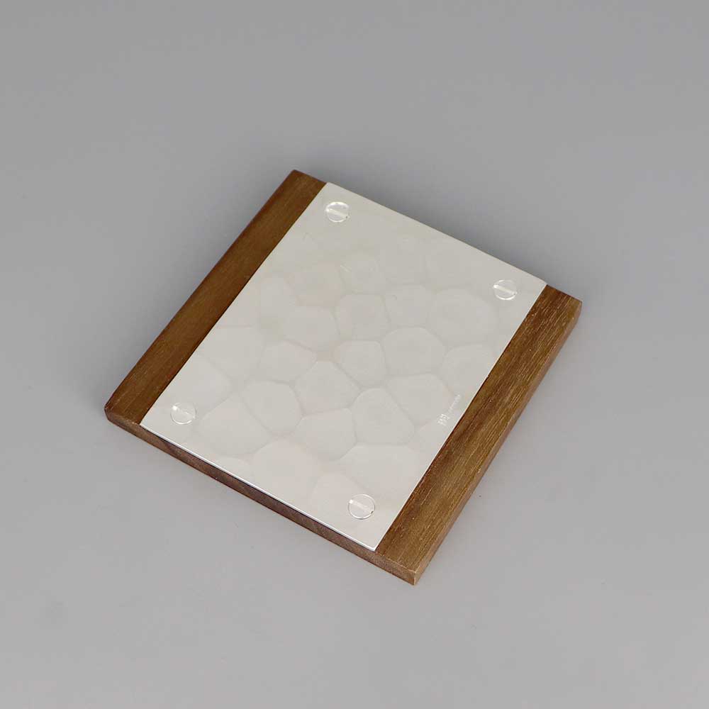 Dessous de bouteille en métal argenté imprimé, finition satinée, et noyer d’Amérique.