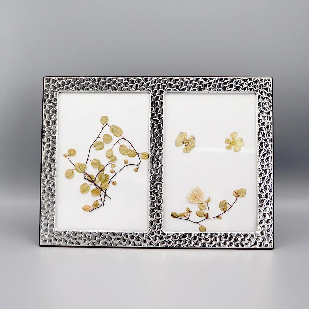 Double cadre photo en Argent massif, verni pour un entretien facile, style Ecailles, avec dos en bois massif.
