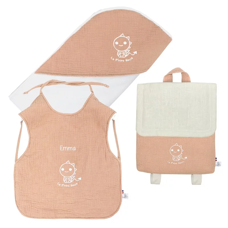Le kit « Grande Goule » est un cadeau parfait pour les plus grands ! Il contient : Le bavoir pour les grands. Il est parfaitement adapté pour la découverte et l’apprentissage de la nourriture. Une couche imperméable est cachée à l’intérieur pour une excellente étanchéité. Le sac à dos, le nouveau camarade d’aventures de vos héros ! Le sac à dos l’accompagnera à partir de la crèche jusqu’à ses 4 ans. Il peut contenir un cahier A5. La fermeture du sac se fait avec un aimant pour plus d’autonomie ! La sortie de bain ultra douce et moelleuse, un réel bonheur pour envelopper votre petite…