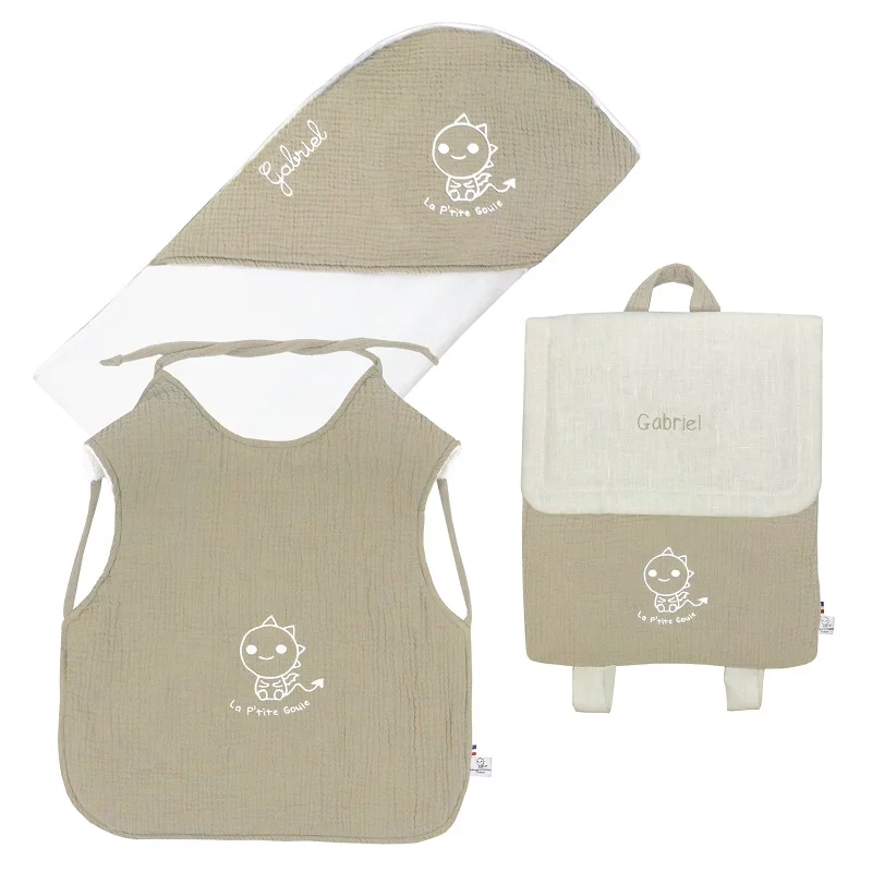 Le kit « Grande Goule » est un cadeau parfait pour les plus grands ! Il contient : Le bavoir pour les grands. Il est parfaitement adapté pour la découverte et l’apprentissage de la nourriture. Une couche imperméable est cachée à l’intérieur pour une excellente étanchéité. Le sac à dos, le nouveau camarade d’aventures de vos héros ! Le sac à dos l’accompagnera à partir de la crèche jusqu’à ses 4 ans. Il peut contenir un cahier A5. La fermeture du sac se fait avec un aimant pour plus d’autonomie ! La sortie de bain ultra douce et moelleuse, un réel bonheur pour envelopper votre petite…