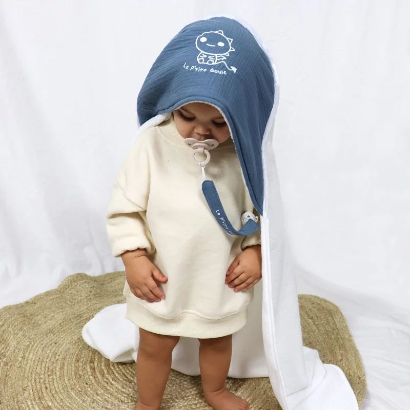 - Sortie de bain : double gaze 100% coton + éponge 80% coton et 20% polyester