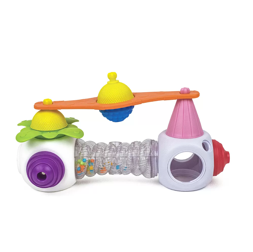 - + 10 mois, votre enfant découvre les textures et les couleurs des perles et secoue le bâton.