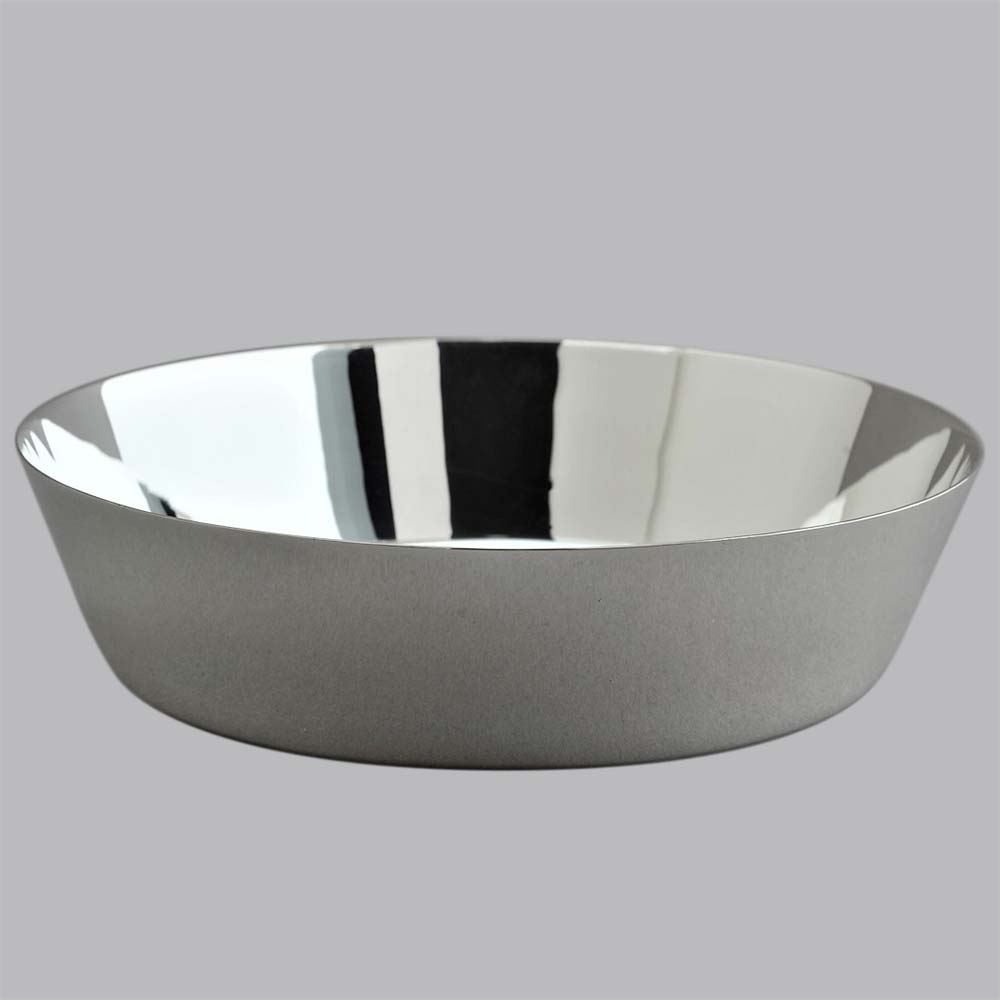 Jatte MENTON en métal argenté. Cette pièce aux lignes sobres et épurées pourra avoir différentes fonctions: plat à légumes, corbeille de fruits, corbeille à pain… D’une hauteur 5,5 cm pour un diamètre de 21 ou 24 cm cette pièce pourra passer au four et au lave-vaisselle.