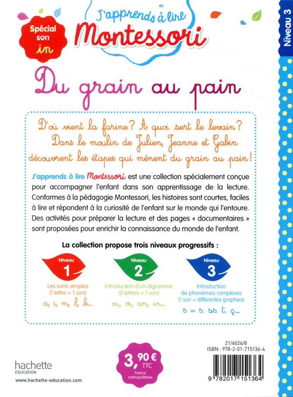 Le livre « Du Grain au Pain – Spécial son in » de la collection « J’apprends à lire Montessori » est une création de l’auteure Charlotte Jouenne. Spécialement conçu pour aborder le son « in », ce livre offre une approche pédagogique basée sur les principes de la méthode Montessori. Grâce à des illustrations attrayantes et un texte adapté, il propose une expérience d’apprentissage enrichissante pour les enfants. Accessible à un public non averti, ce livre vise à soutenir le développement des compétences en lecture de manière interactive et stimulante.