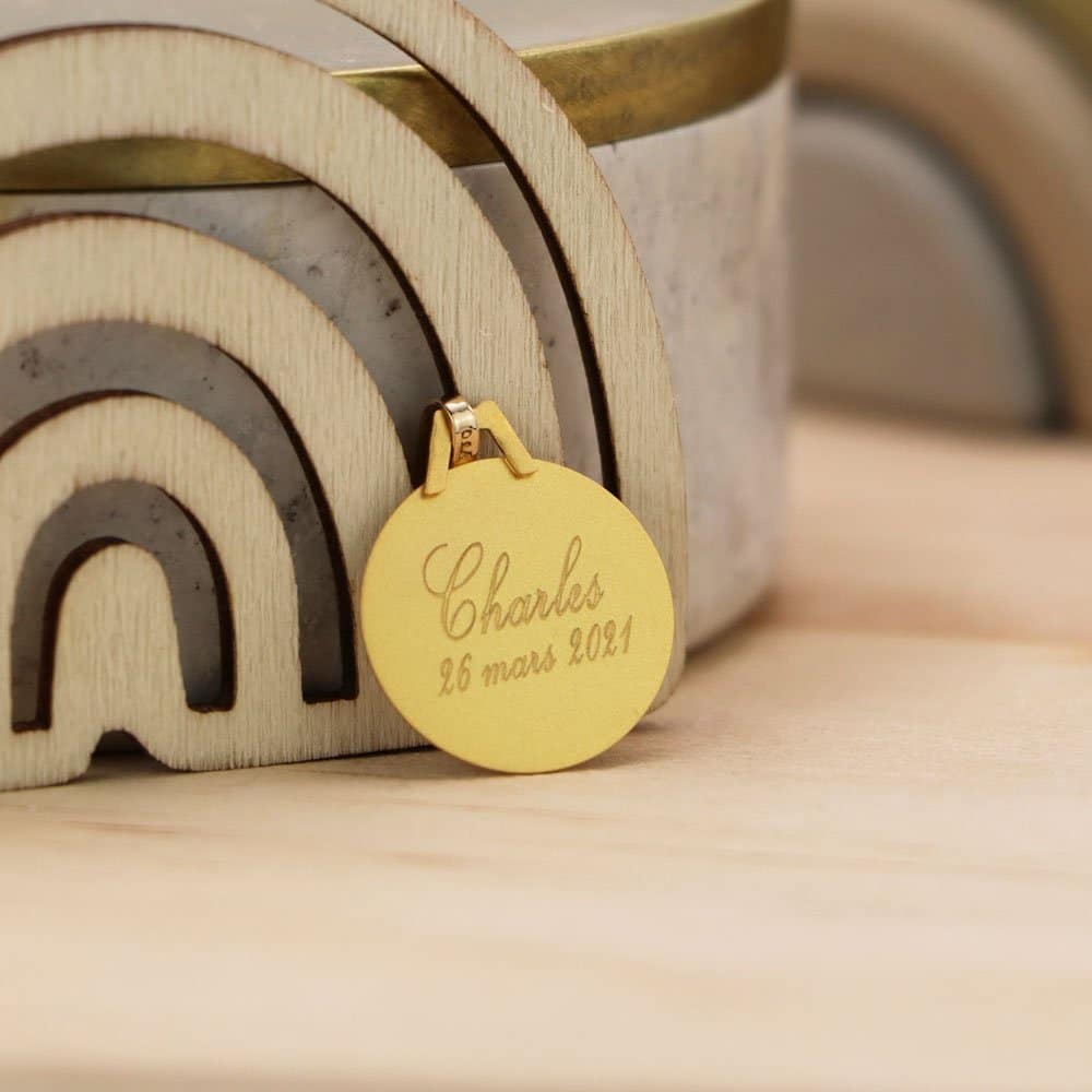 En or jaune 18 carats, cette médaille au motif doux et intemporel, saura s’associer à la chaine de votre choix. Cette médaille est de finition mate avec une bordure brillante.