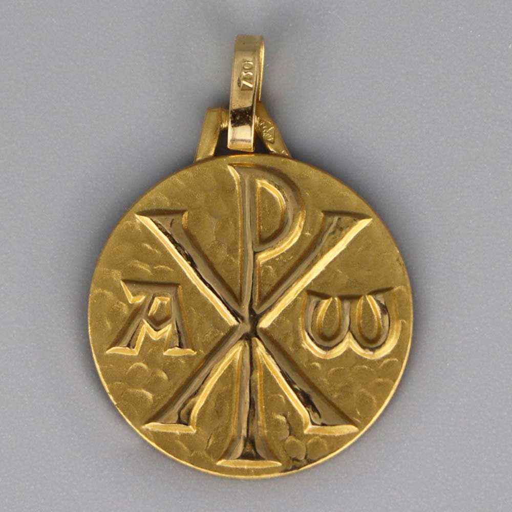 Médaille de baptême Chrisme. Or jaune 18 carats (2.45 g). Ø 18 mm.