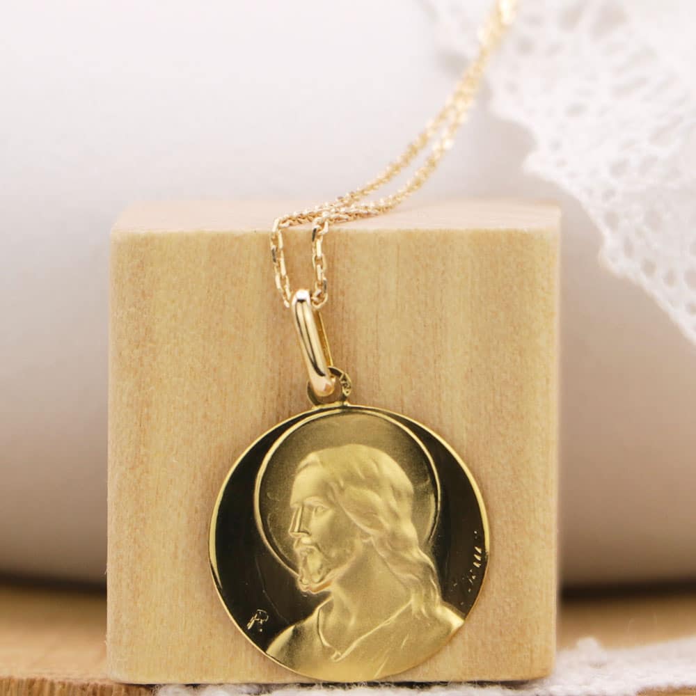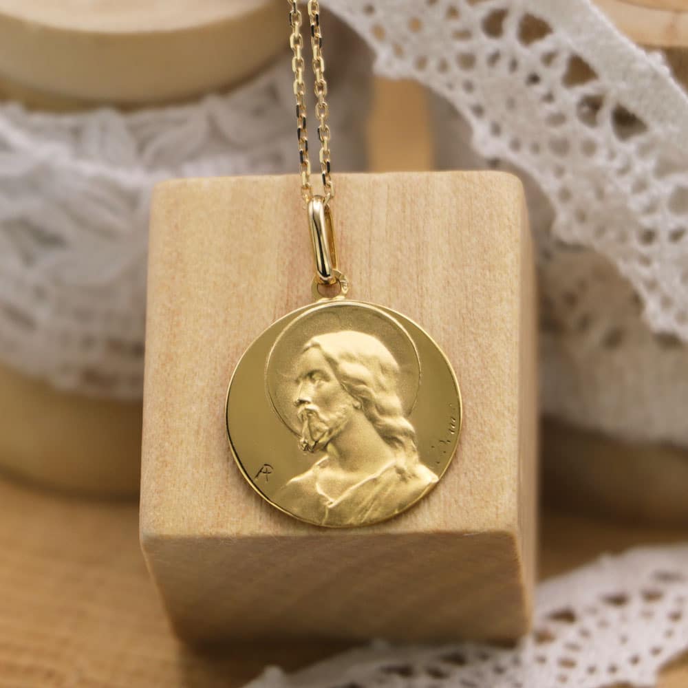 Médaille de baptême en Or jaune 18 carats de 18 mm représentant le Christ auréolé de profil satiné sur un fond brillant. Les différents traitement satiné et brillant donne beaucoup de caractère à cette jolie médaille.