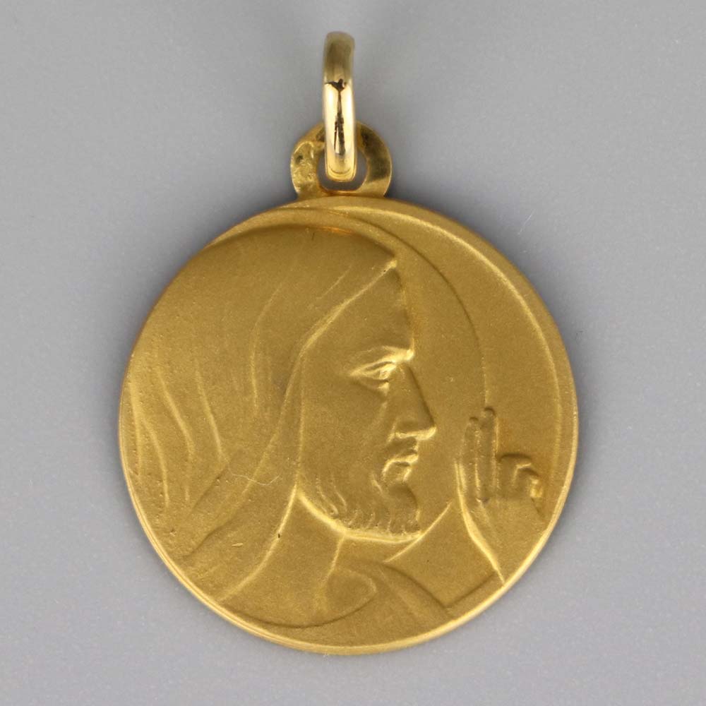 Médaille de baptême or 18 carats, ronde, présentant le visage du Christ et sa main bénissante.