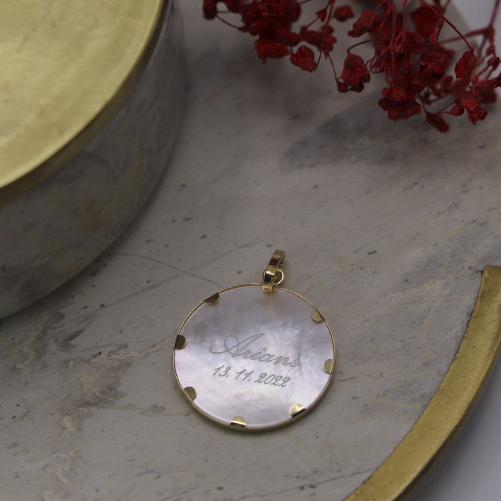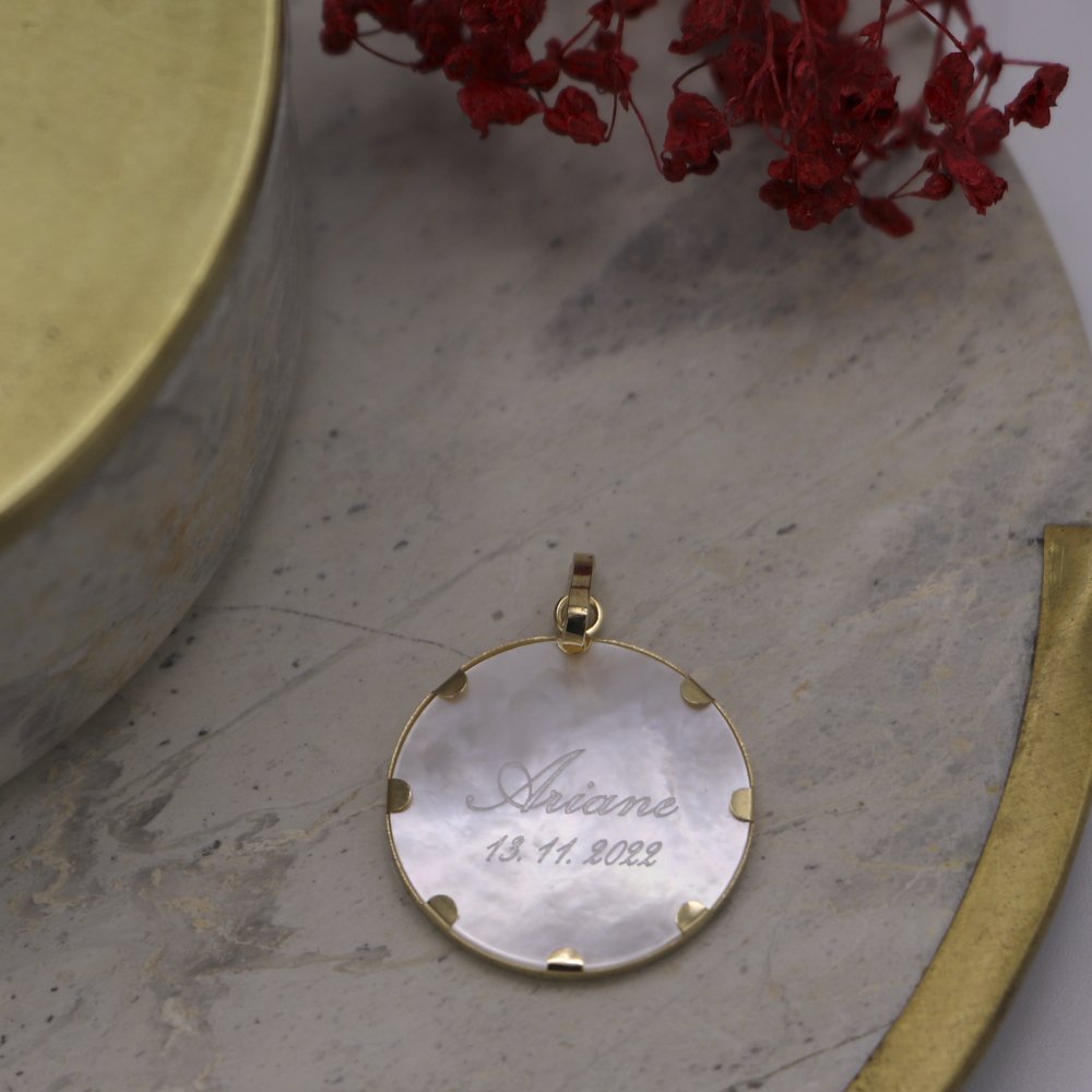 Médaille de baptême en Or jaune 18 carats et nacre.