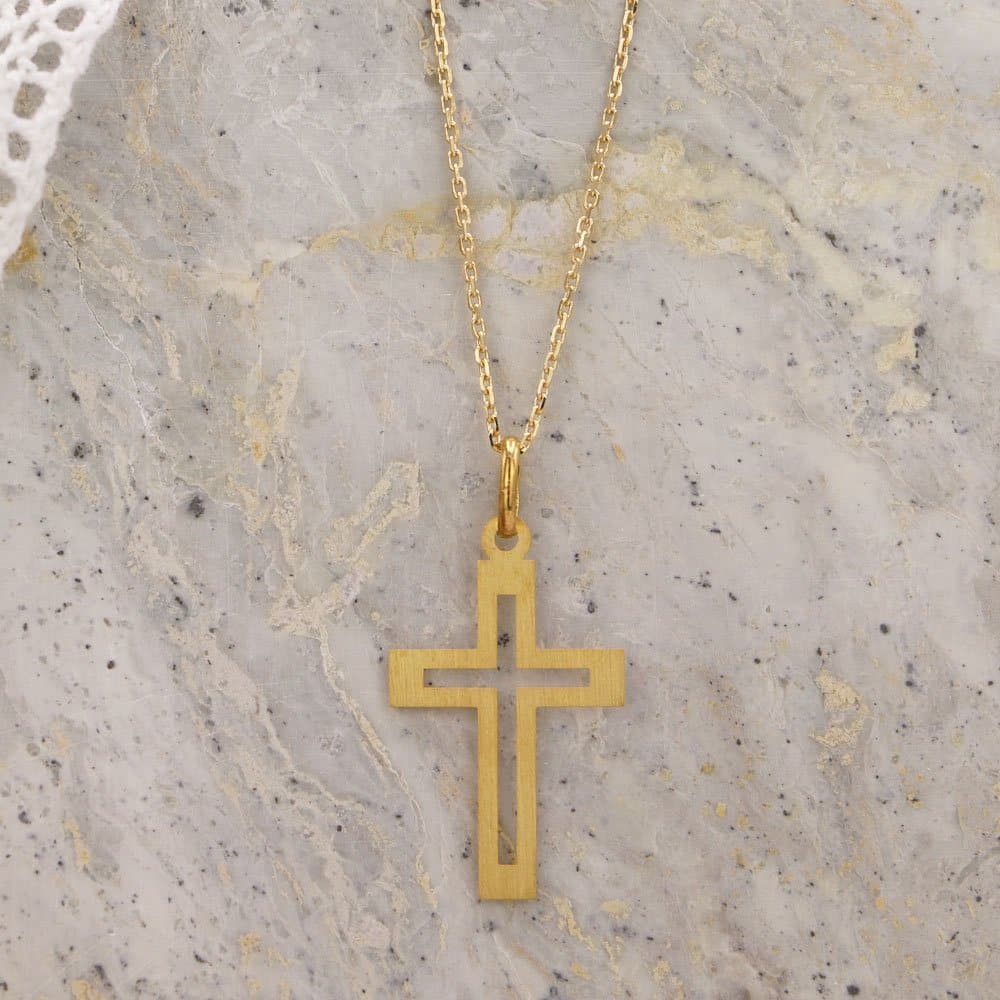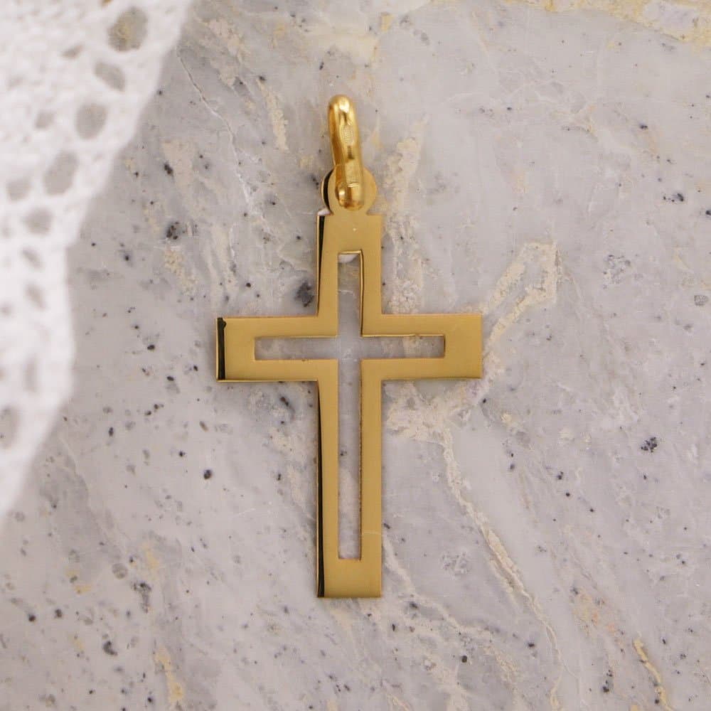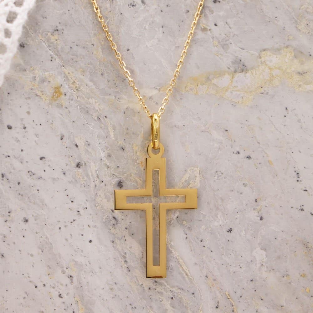 Cette croix latine ajourée sobre et actuelle saura sublimer votre cou. Son design contemporain unisexe ainsi que ses jolies proportions en feront le cadeau idéal à offrir pour un baptême ou une communion. Associée à la chaine en or de votre choix, elle pourra être portée en toutes occasions. Ce pendentif sera ainsi le symbole discret de toute l’affection que vous portez à votre filleul(e)