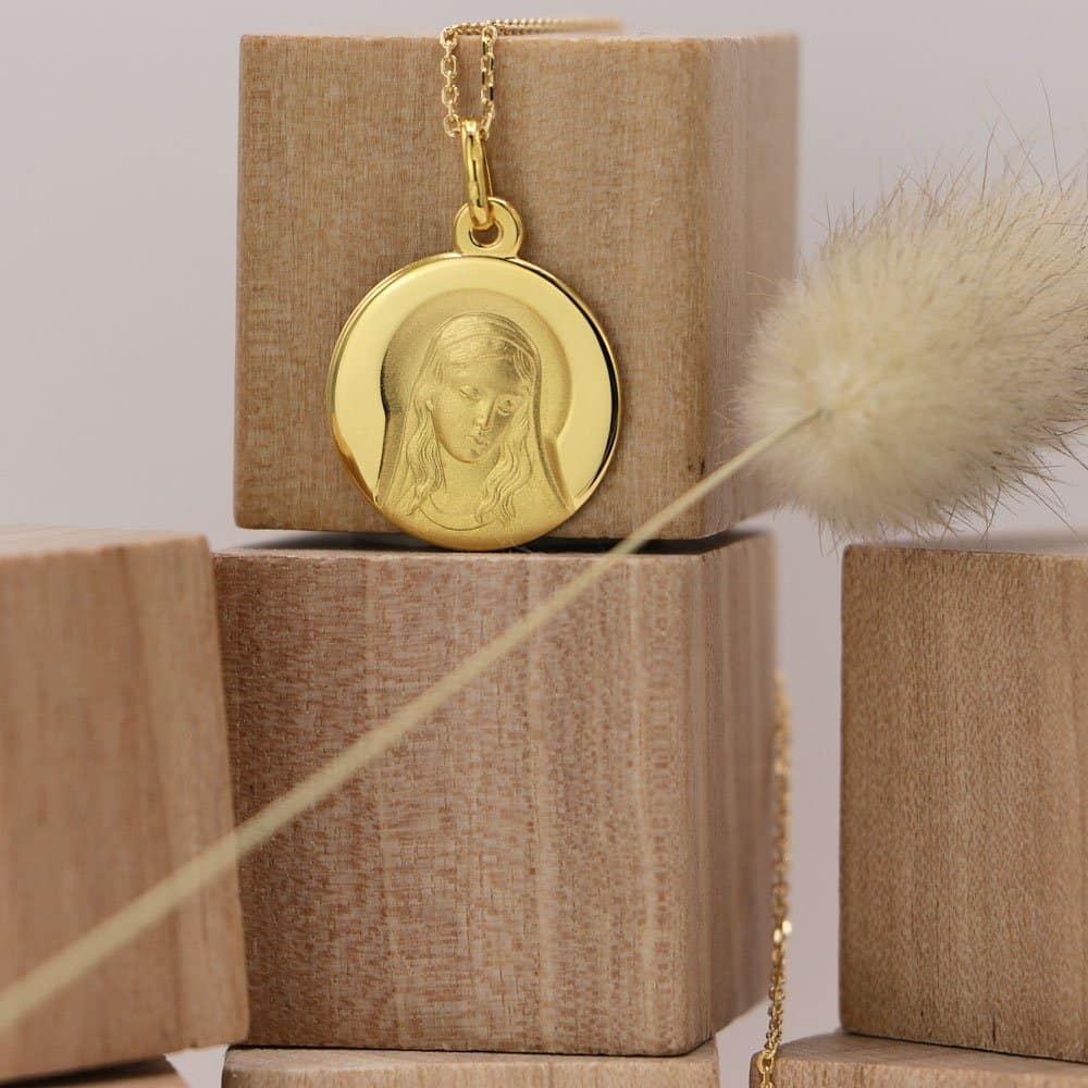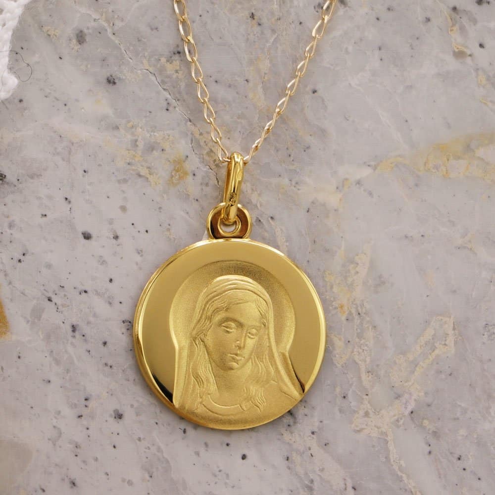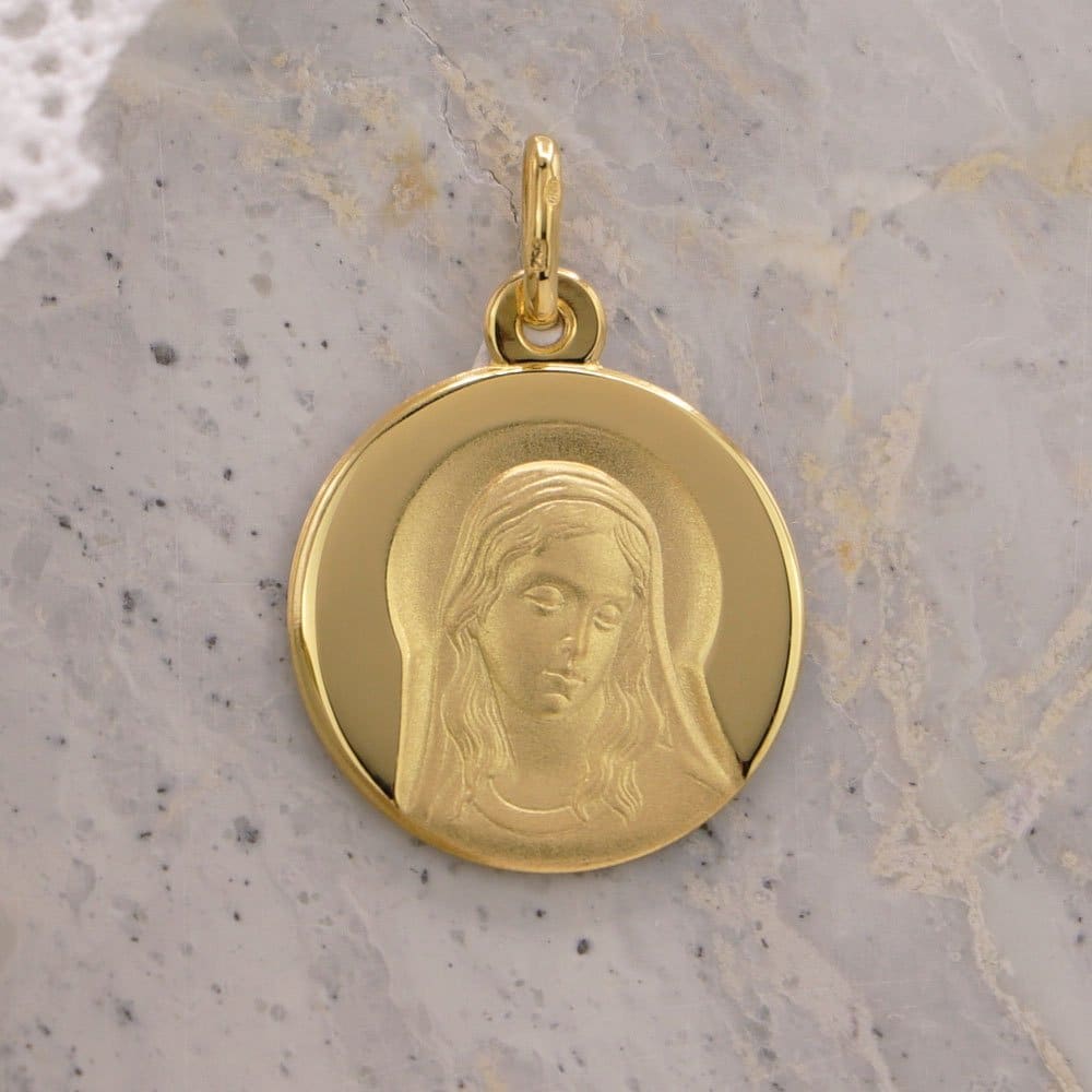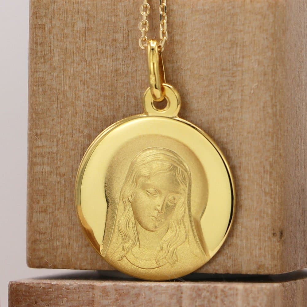 Cette médaille en or jaune 18 carats représente la Vierge Marie délicatement auréolée avec son motif en creux.