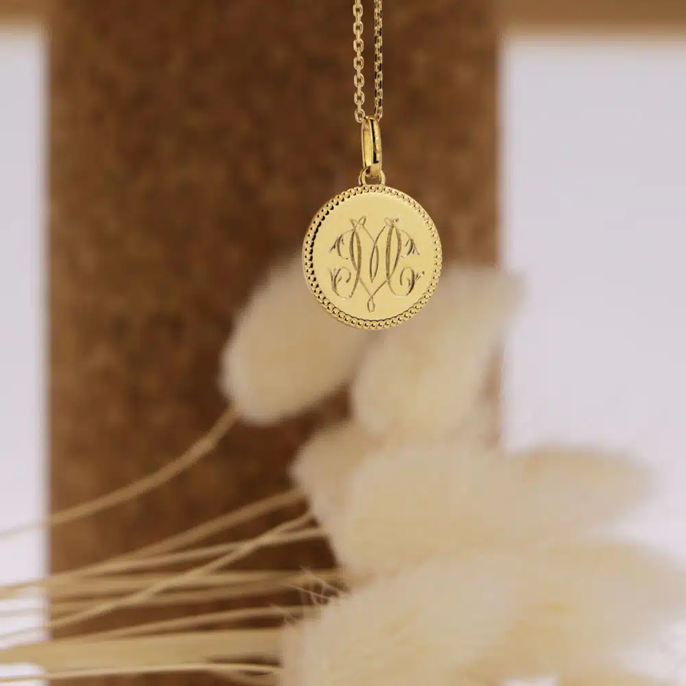 Médaille Jeton perlé en Or jaune 18 carats 15mm gravé à la main