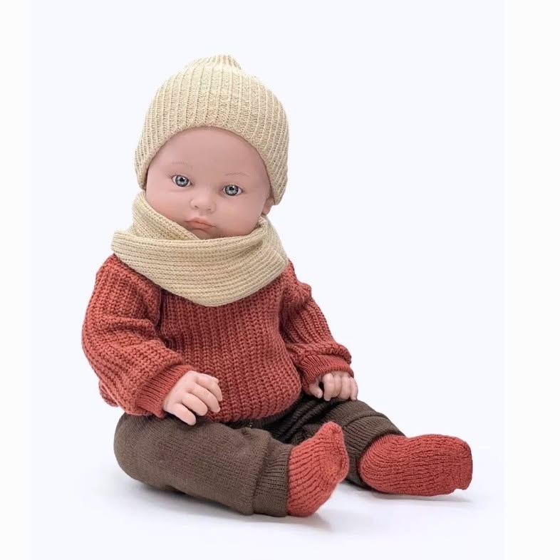 - Vêtements : un pull en maille rouge Bordeaux, un pantalon en maille chocolat, un bonnet et un tour de cou en maille crème et une paire de chaussettes assorties Minikane fabriqués en France