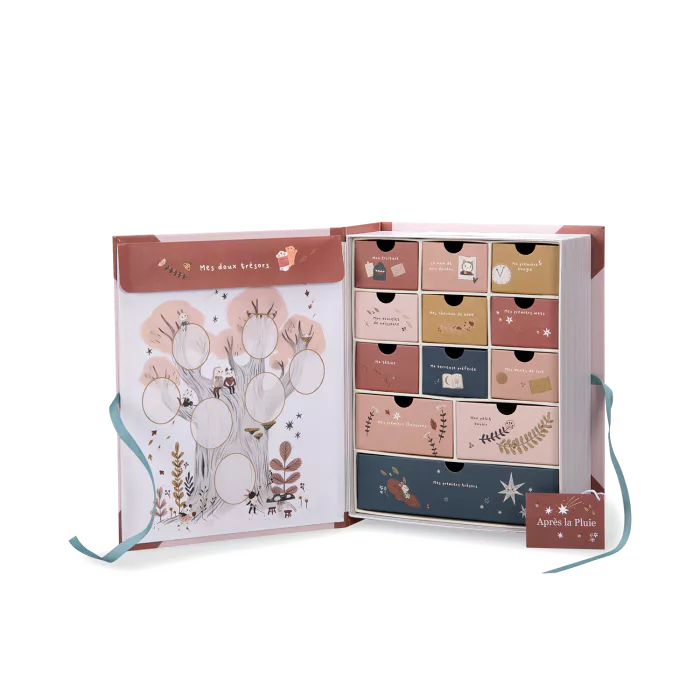 Conservez les souvenirs de votre Bébé grâce à cet adorable coffret équipé de 12 tiroirs prévus à cet effet ! Mèche de cheveux, bracelet de maternité, première bougie … etc. Chaque compartiment contient un fragment de nos merveilleux moments passés avec notre enfant ; ces instants qu’on garde dans un coin de notre coeur et dans cette précieuse boite ! Une pochette illustrée représentant un arbre généalogique à compléter permet de recevoir faire-part, premiers dessins, invitations aux goûter d’anniversaire … Un jour lorsqu’il sera grand, c’est la joie dans les yeux de votre petit curieux qui brillera quand vous lui présenterez chacun de ces petits trésors témoins de son histoire ! Magique, on vous dit !!!