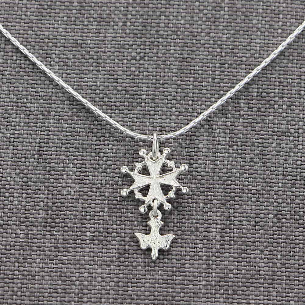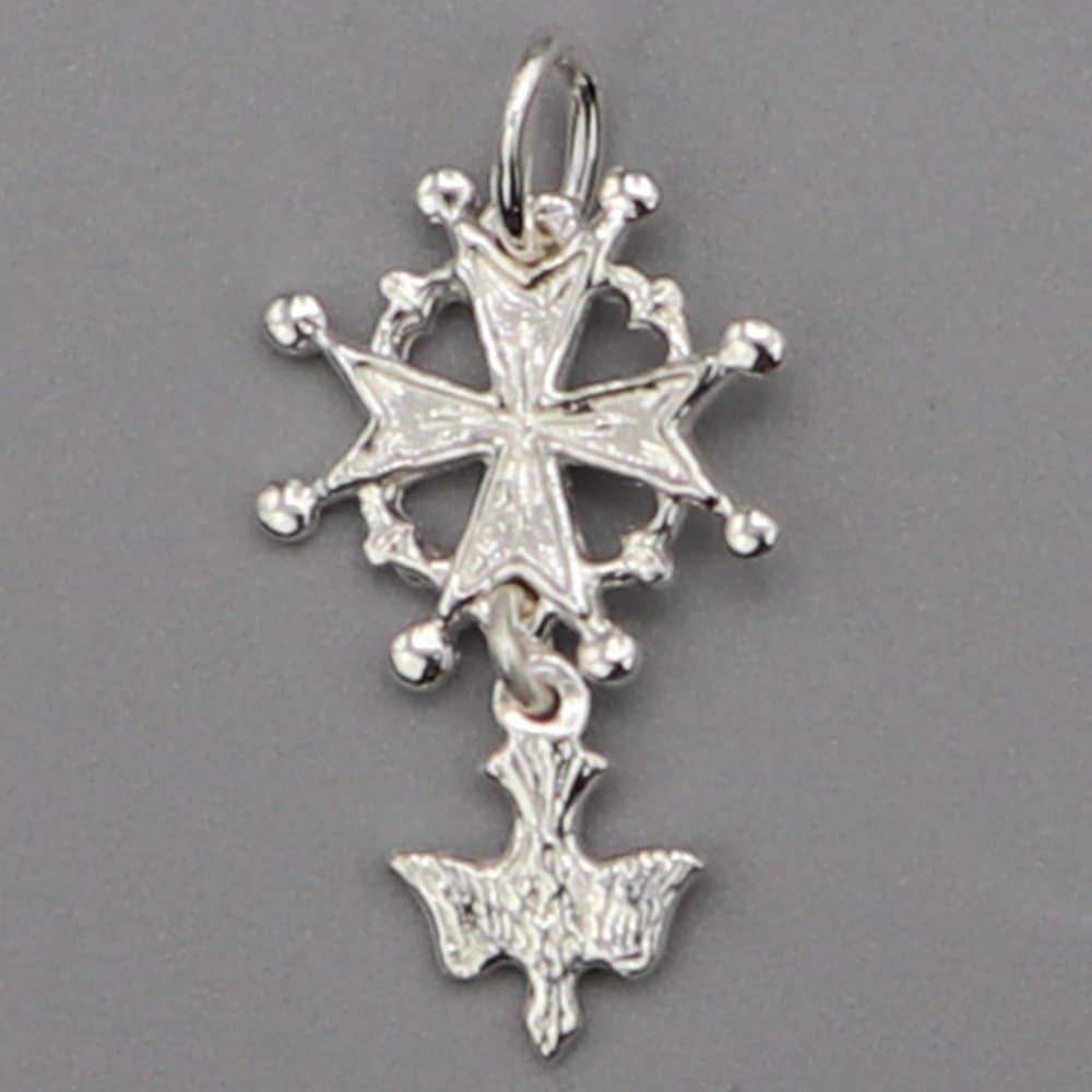 Cette croix huguenote, symbole protestant, originaire du Sud de la France, en forme de croix de Malte aux pointes garnies de perles pourra être associée à la chaine de votre choix afin de créer un ensemble personnalisé et unique.