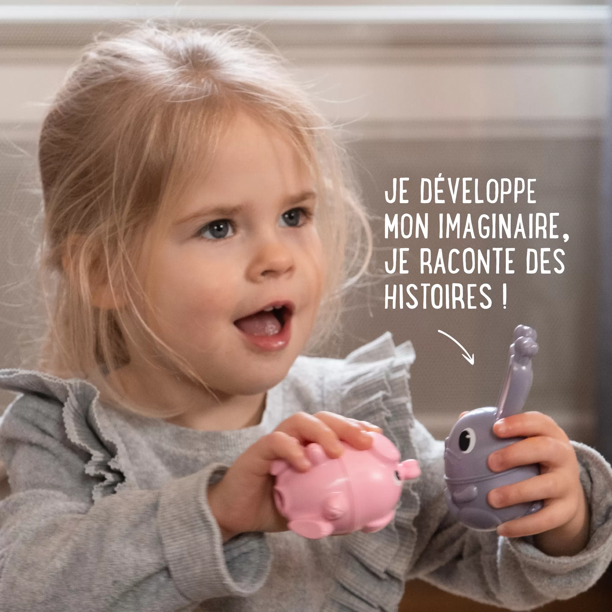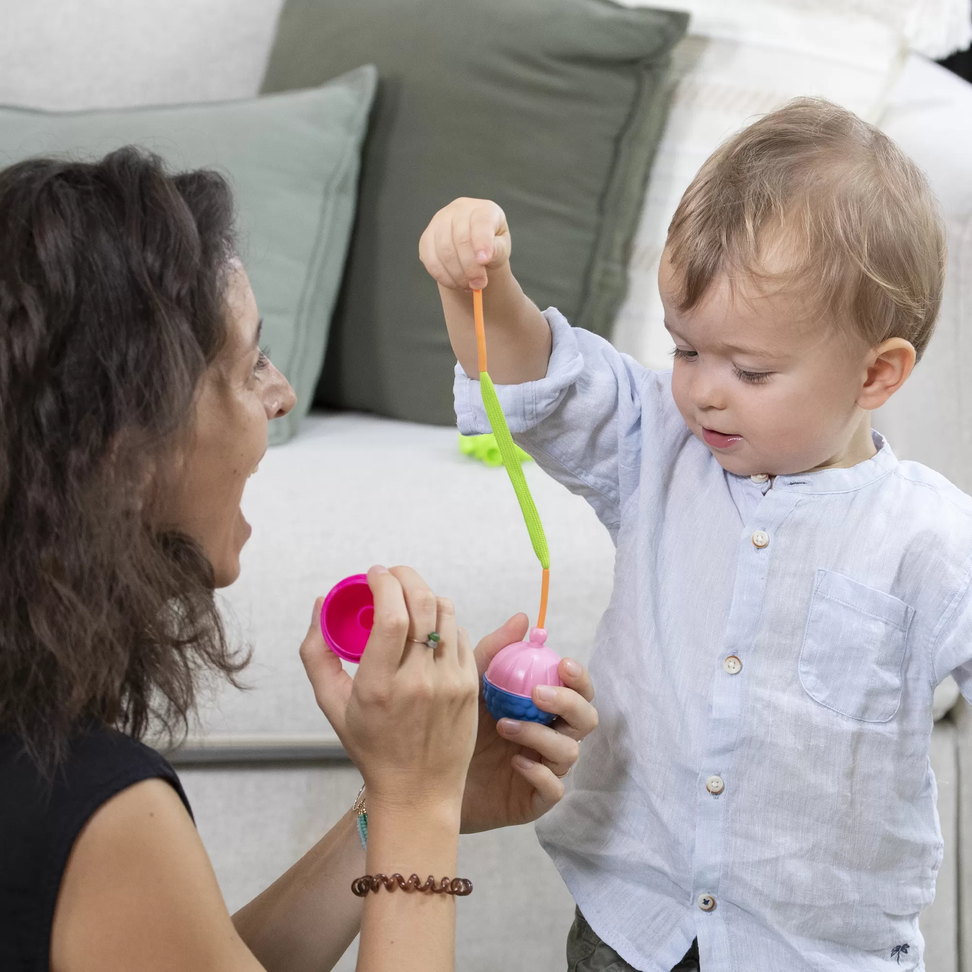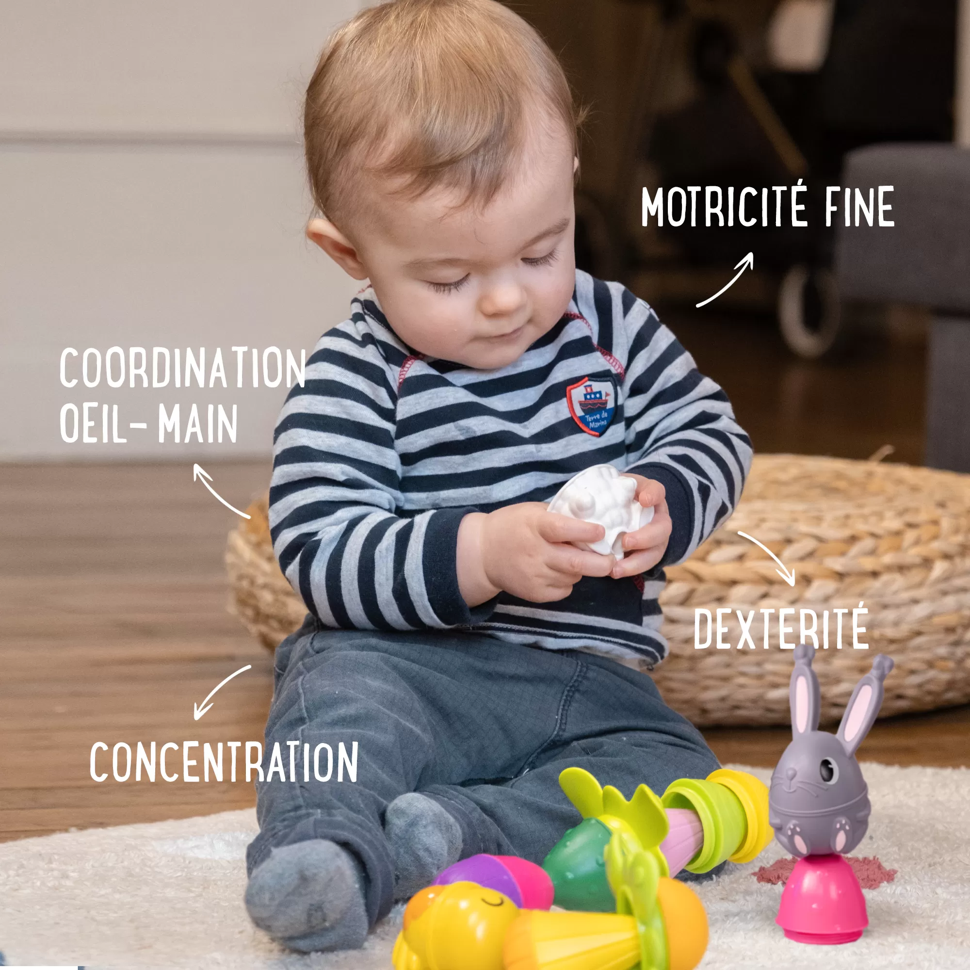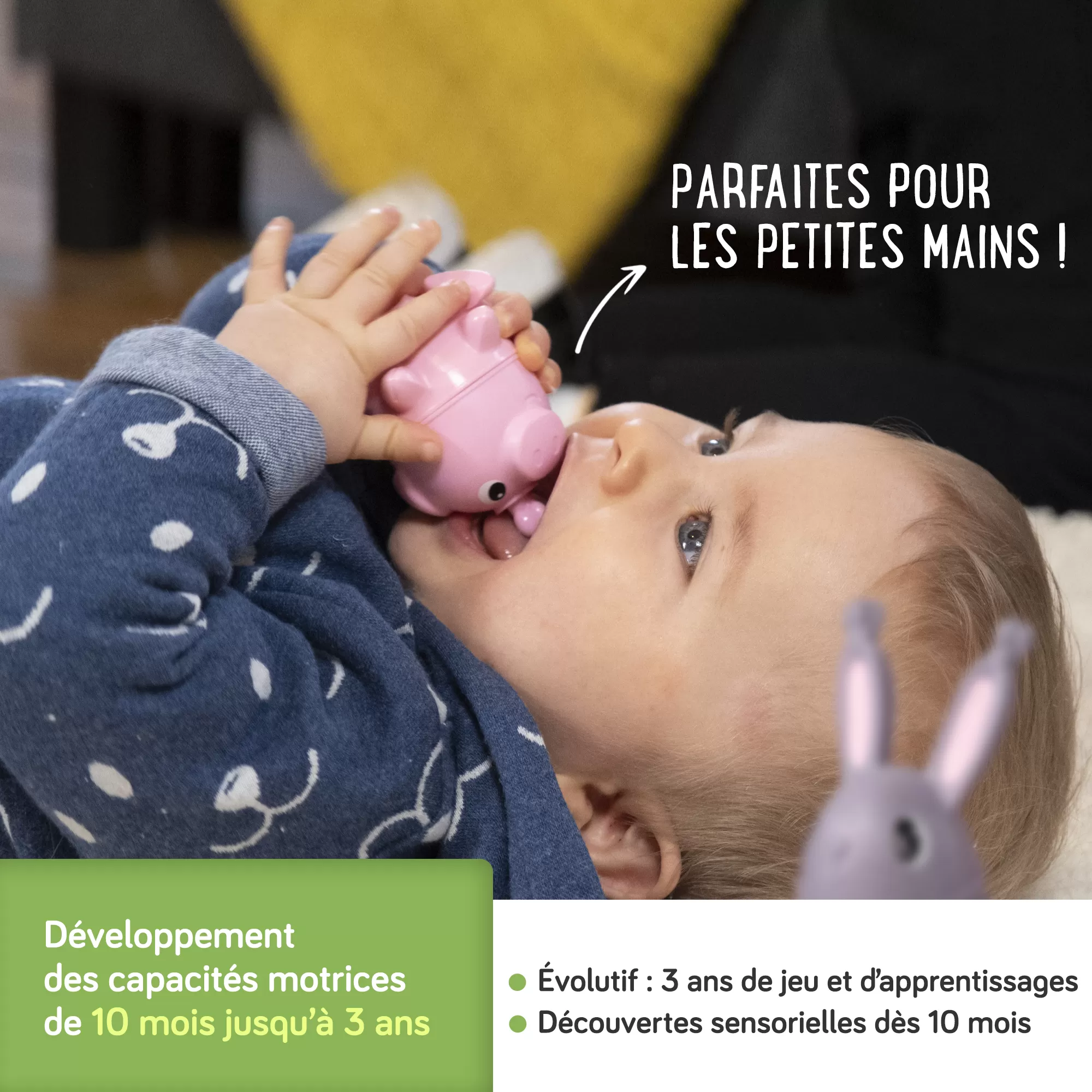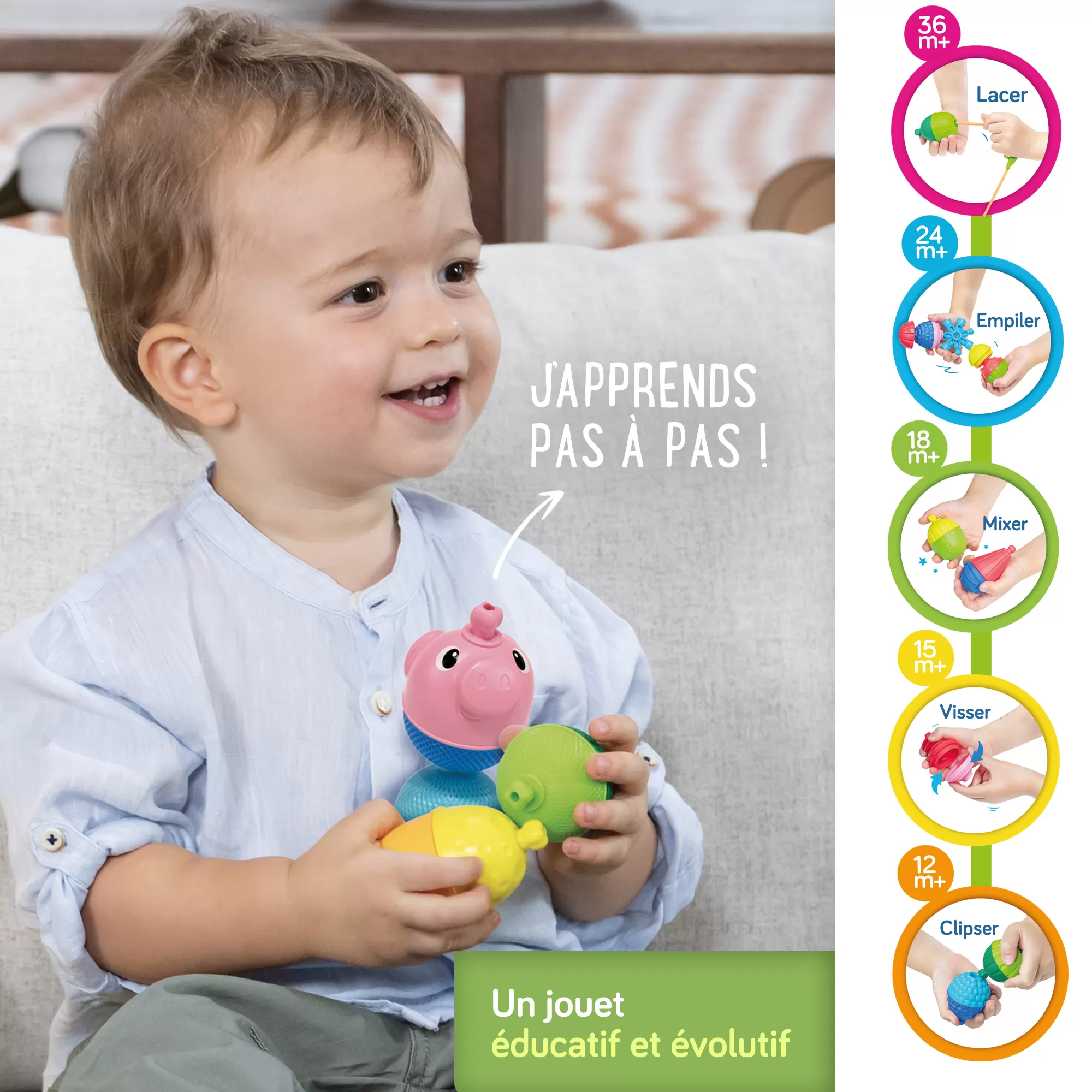 Des grosses perles évolutives dont chaque fonction correspond à une étape du développement de l’enfant de 10 à 36 mois : Clipser, visser, combiner, construire, lacer !