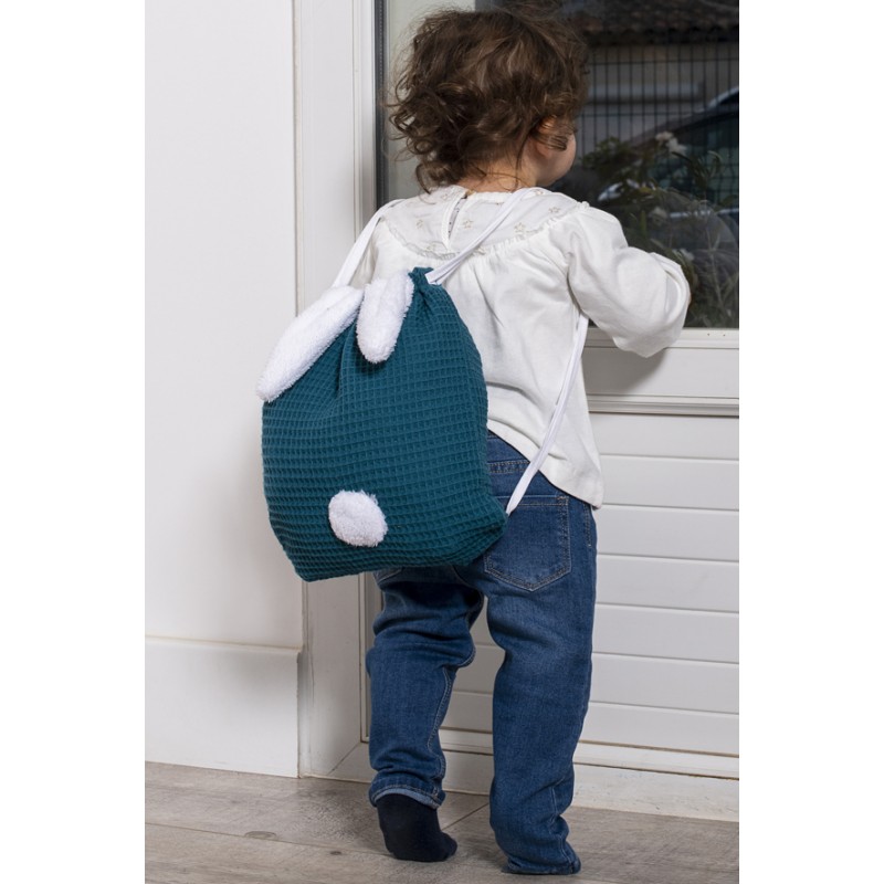 Ce sac à dos lapin, ultra léger et robuste, permet aux baroudeurs en herbe d’être autonomes et de gérer eux-mêmes leurs petites affaires ! Couleur : paon En nid d’abeille 100 % coton Dimensions 30 cm x 27 cm Lavage en machine A partir de 2 ans