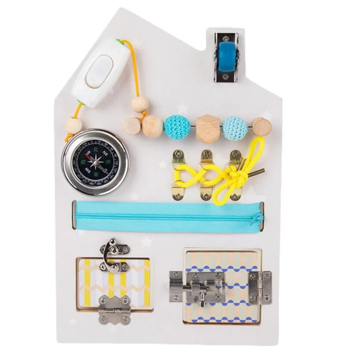 Elle est fabriquée en bois naturel et durable et offre une variété d’activités éducatives pour aider votre enfant à développer ses capacités motrices, cognitives et sensorielles. Cette planche contient des éléments tels qu’un boulier, des lacets, des serrures à déverrouiller et bien d’autres comme une boussole pour éduquer l’enfant sur divers concepts et compétences de manière ludique.