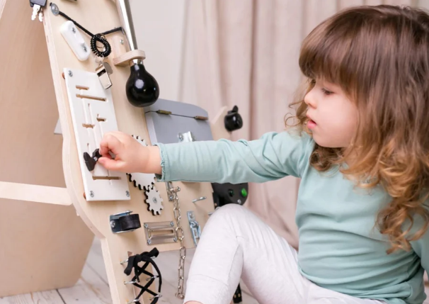- Éléments Inclus : La planche est équipée de 19 éléments variés, tels que des engrenages, une serpillière, des feux de circulation, une serrure à clé, etc.