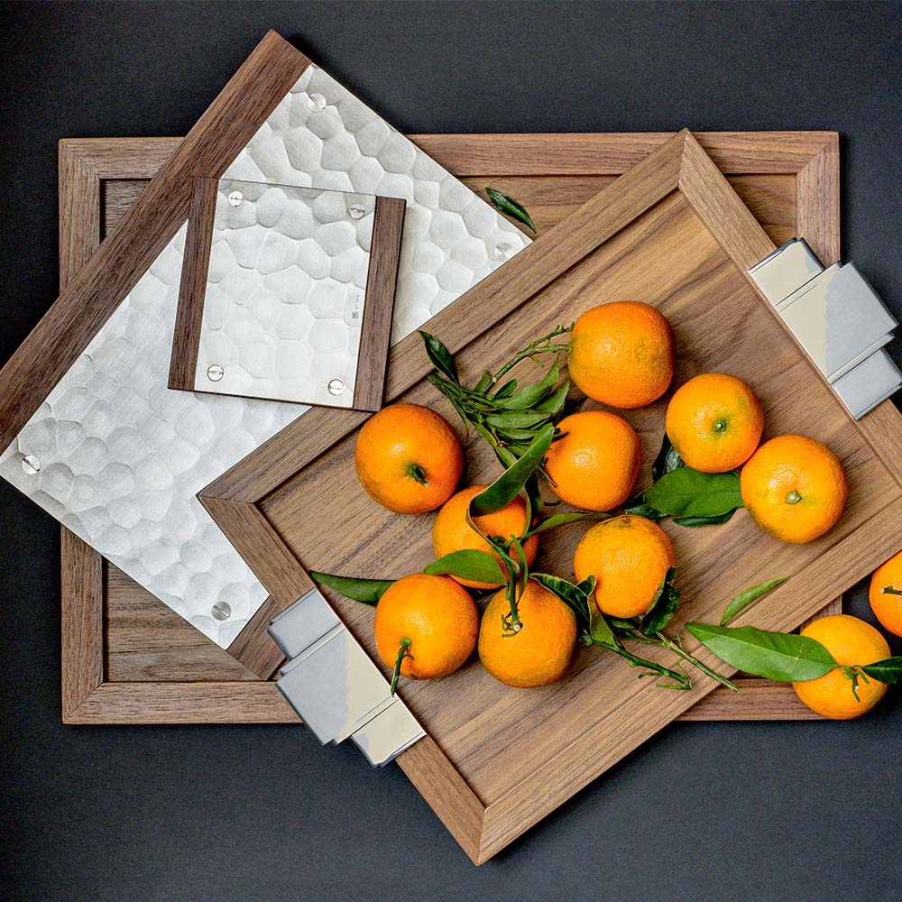 31.5 x 21 cm. Petit plateau en noyer d’Amérique et poignées en métal argenté. Une élégance incomparable, un esprit art déco. Un cadeau d’exception.
