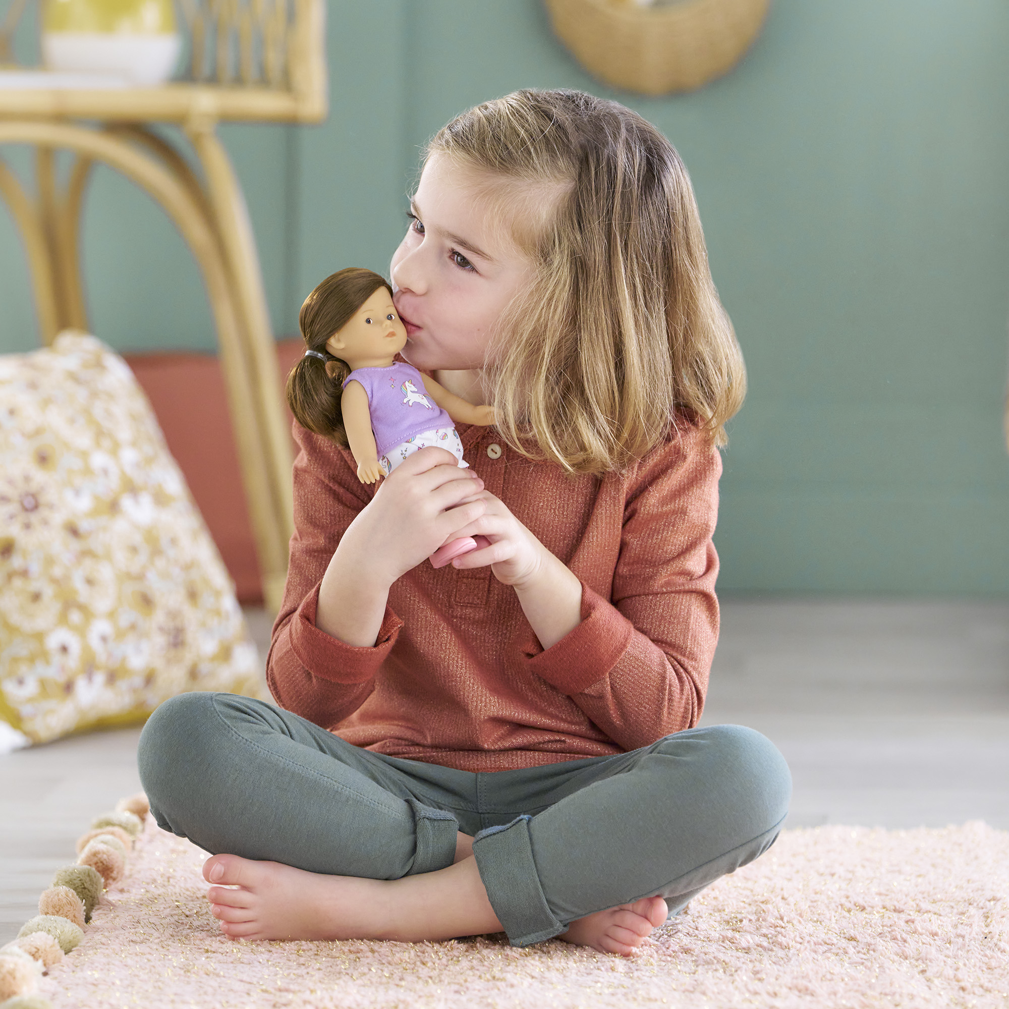 Voici Romy ! C’est une poupée ravissante avec un très beau visage, de jolis yeux bruns, un corps en vinyle et de longs cheveux bruns à coiffer. Elle est vêtue d’une robe rose en tulle pailletées, d’une culotte et de petits souliers. Dans ce coffret, on trouvera un serre-tête licorne avec des extensions colorées pour la coiffer ainsi qu’une seconde tenue composée d’un short imprimés licornes et d’un t-shirt assorti pour la changer.