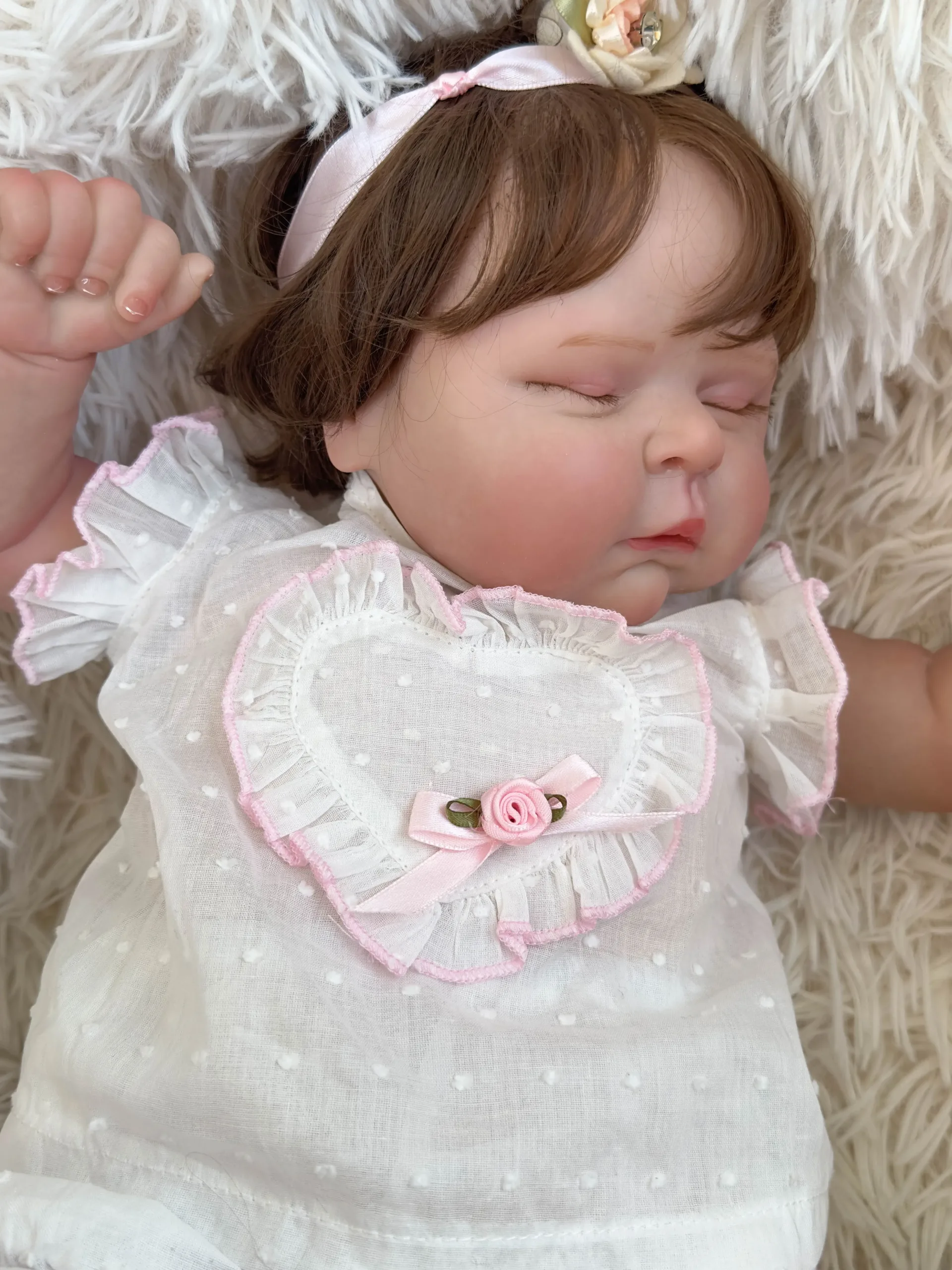 Ses cheveux bruns implantés à la main sont agréables à coiffer et participent à son réalisme. La tenue légère et élégante complète son allure de petit ange endormi.