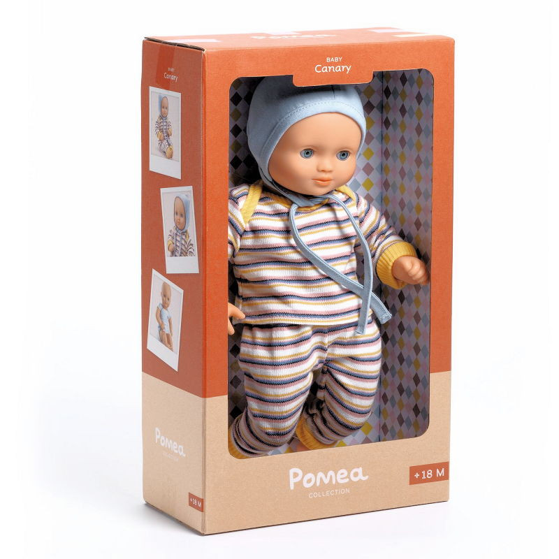 Voici Canary ! Un poupon facile à manipuler pour les petites mains ! Son corps est souple et ses yeux se ferment lorsqu’il est couché sur le dos. Il est prêt à être adopté par un « mini-parent » qui le câlinera et le soignera bien !