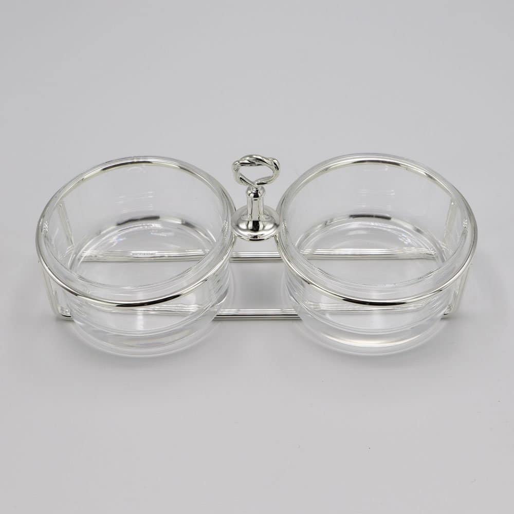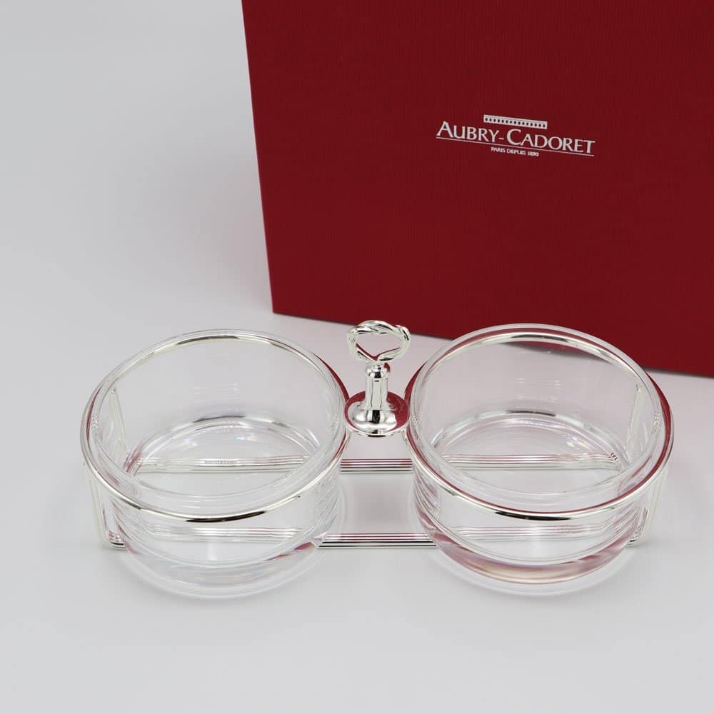 Présentoir à condiments en verre et métal argenté. Ø d’une coupelle: 9 cm H d’une coupelle: 10 cm
