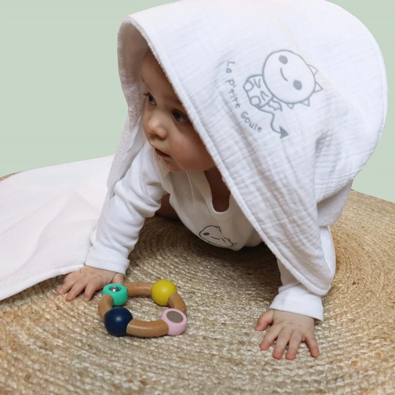 La sortie de bain est une pièce indispensable pour la toilette de bébé ! La sortie de bain La P’tite Goule apporte un grand confort grâce à son tissu en éponge velours. L’éponge velours ultra douce absorbe facilement l’eau tout en étant très délicate et respectueuse pour la peau. La capuche colorée couvrira les cheveux et les oreilles de votre bébé qui sera isolé du froid. Grâce à sa grande taille, la sortie de bain accompagnera votre enfant durant plusieurs années. Cette sortie de bain est un très beau cadeau de naissance ! Cet article est composé de double gaze, un tissu léger…