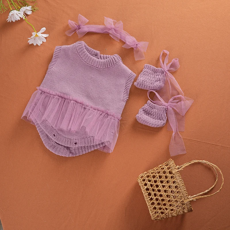 - Ensemble complet : Comprend un body en tricot avec des boutons pratiques, une paire de chaussons assortis avec des rubans et un serre-tête décoratif pour un style harmonieux.